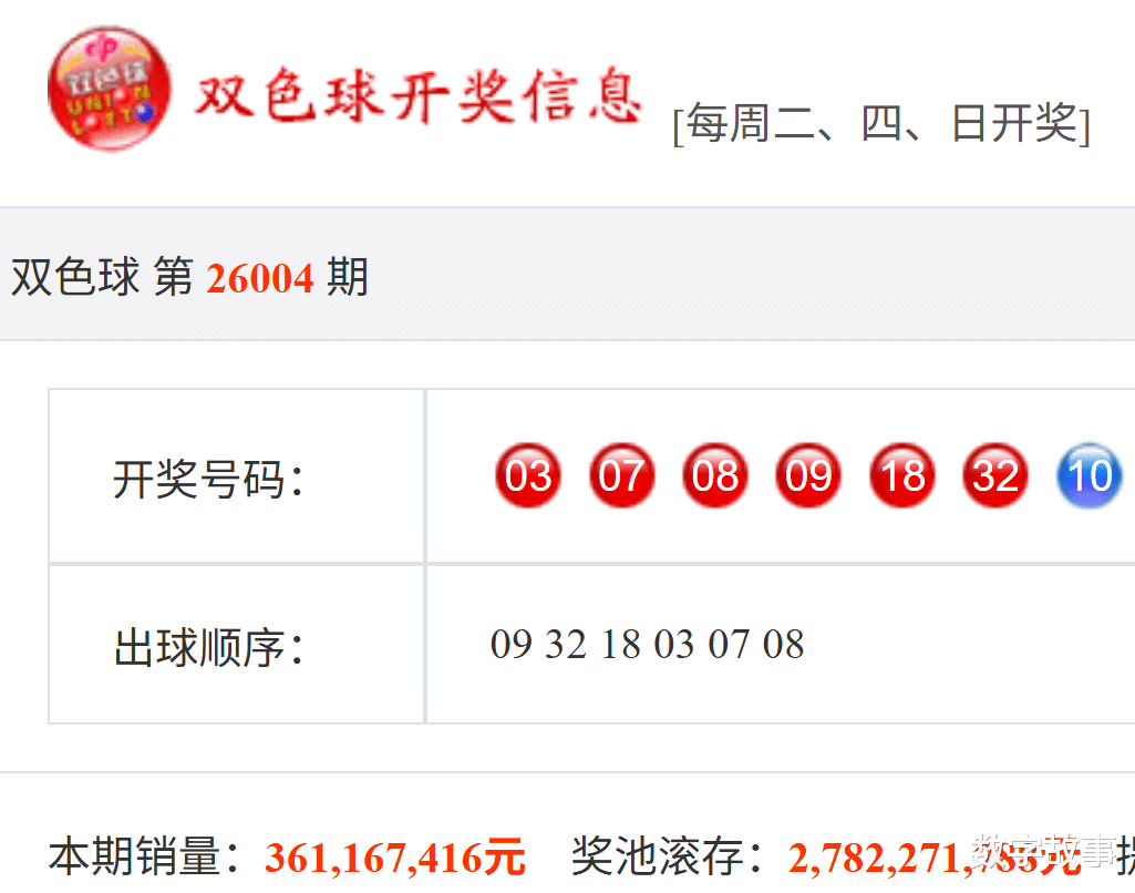 文末有双色球红球三连号7-8-9, 及3-18-32的历史统计。【福彩双色球26004期开奖结果及统计】红球号组合历史上有1期四球相同,蓝球10,4注一等奖,奖池27.82亿(2782271788)。