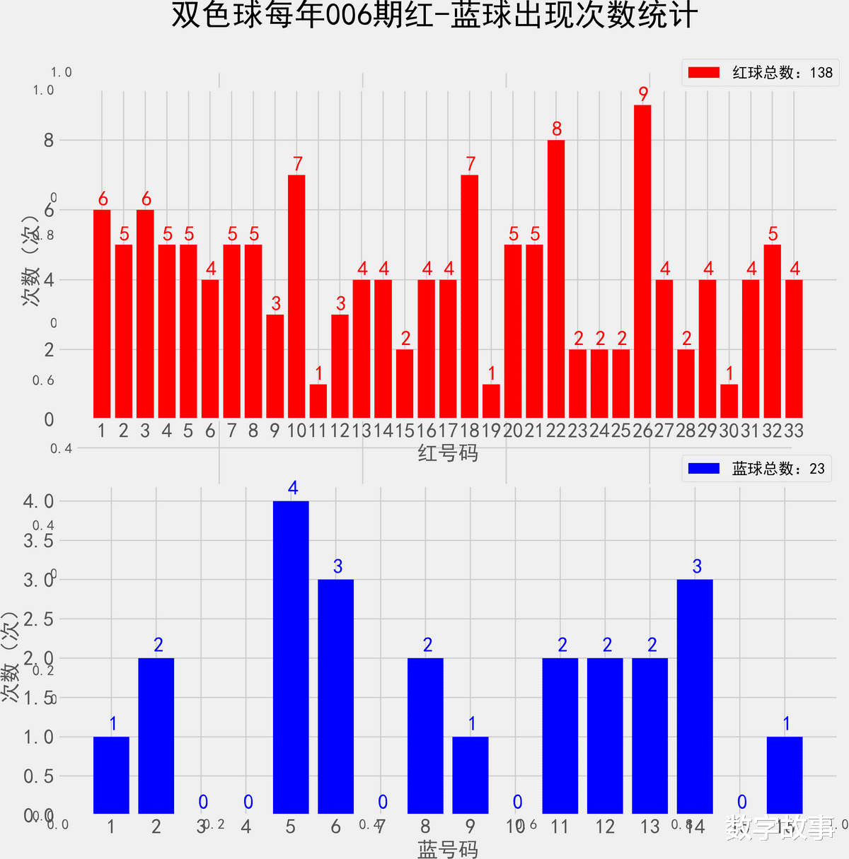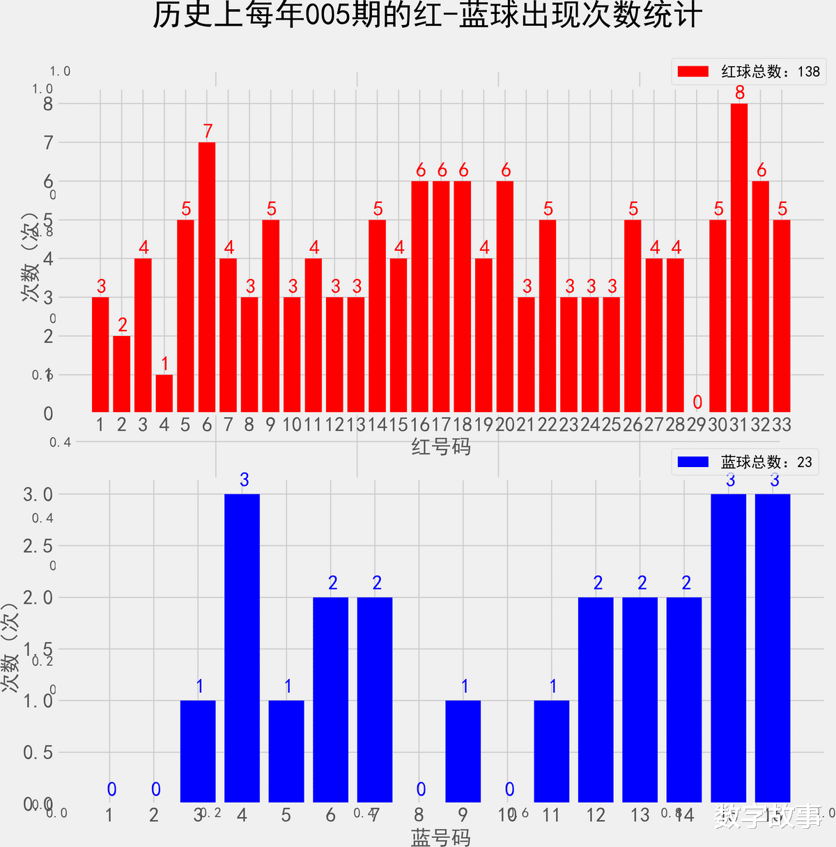 统计每年005期的样本数据:138个红球 23个蓝球