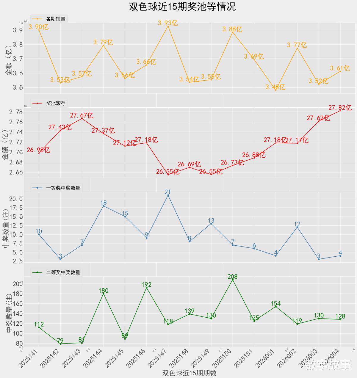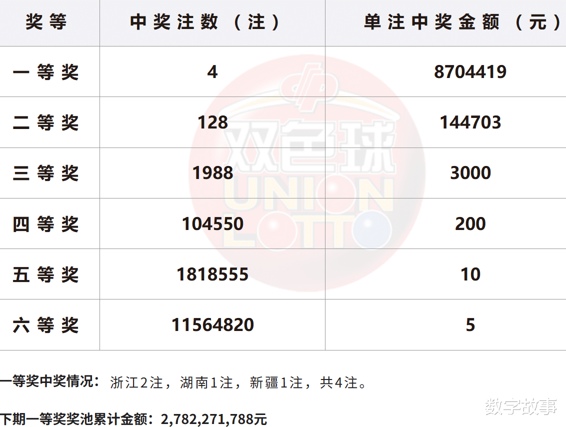 双色球26004期一等奖: 4注二等奖: 128注本期全国销售金额:361167416 元 奖池滚存:2782271788 元.近15期奖池滚存, 中奖情况等信息: