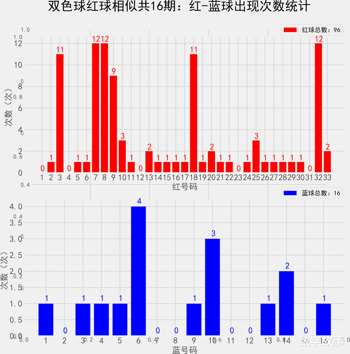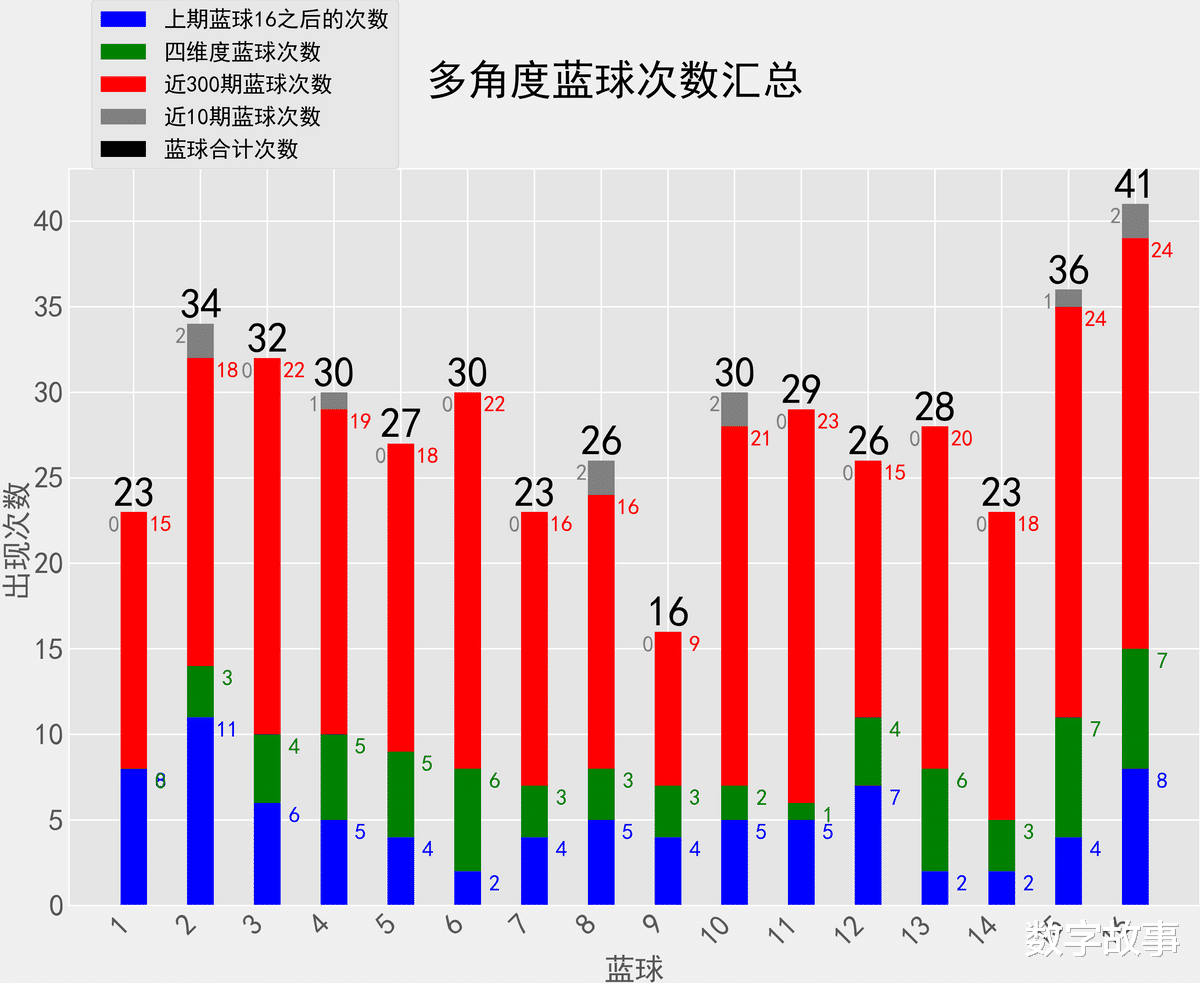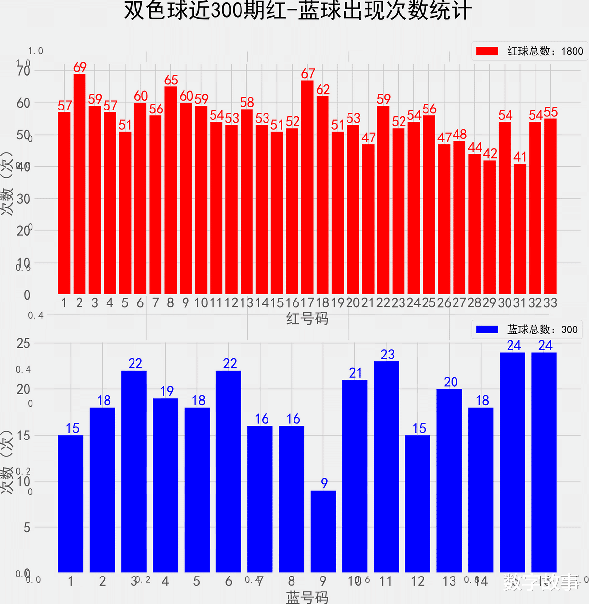 双色球近300期红蓝号统计情况统计样本数据: 1800个红球 300个蓝球