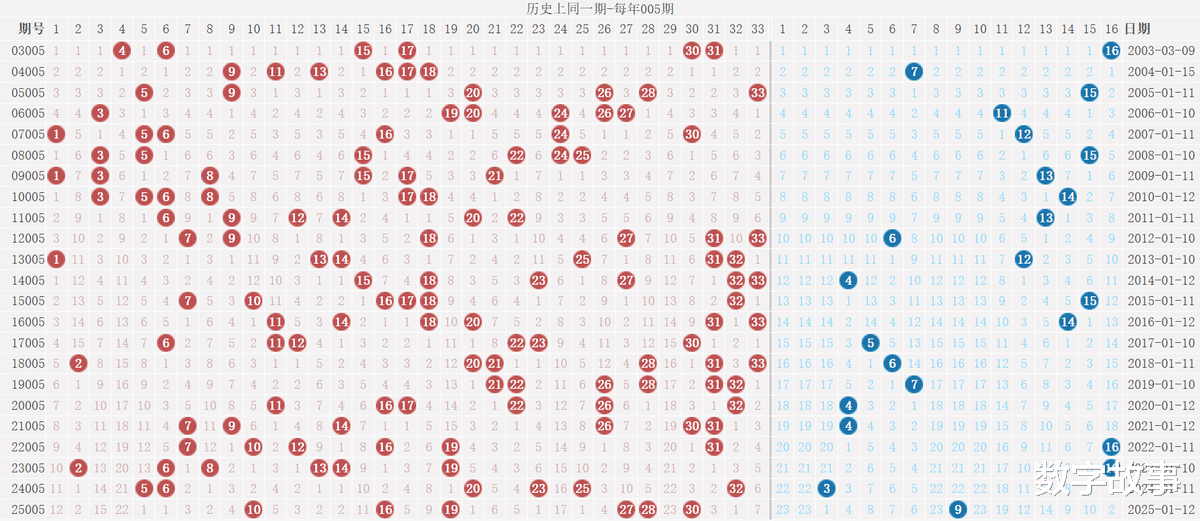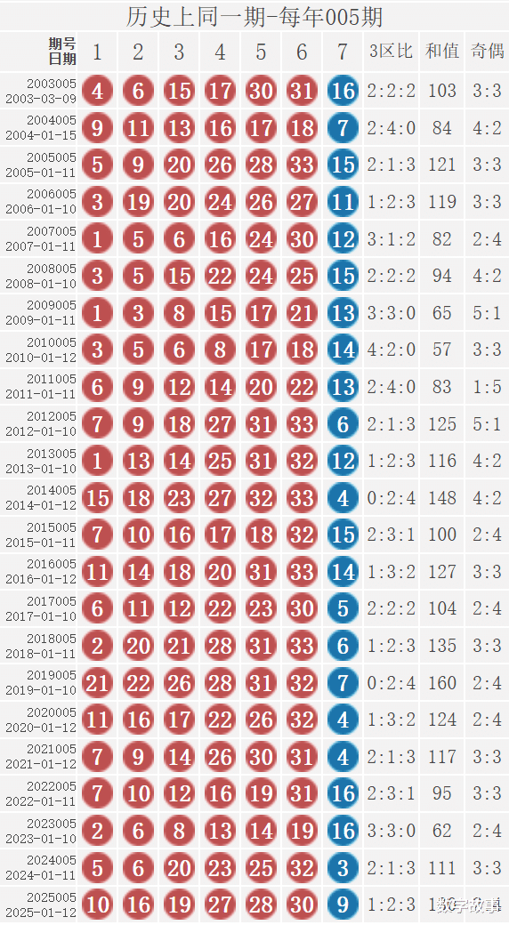2) 历史同一期: 每年005期 (共23期)