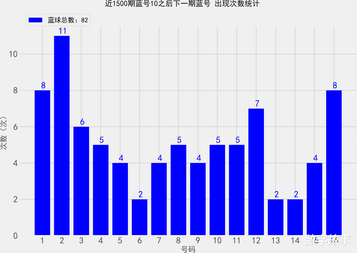 统计近1500期蓝号10之后, 各蓝球的出现次数双色球26004期蓝号是10找出近1500期蓝球10号之后, 下一期出现的所有蓝号,统计其出现次数。,除开这一期,总共出现了82次10号球那么统计的样本数据是82个