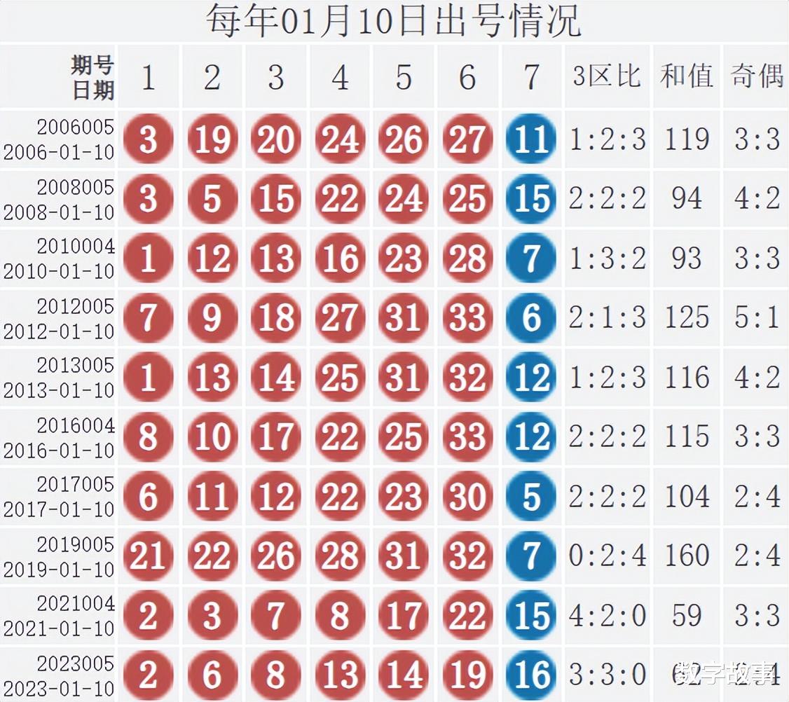 双色球历史上的今天2026-01-10 星期六 双色球不开奖每年01月10日出号情况:
