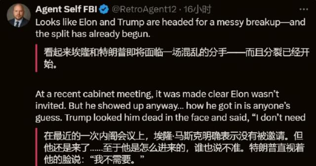 说特朗普与马斯克两人即将决裂,没留一点脸面。