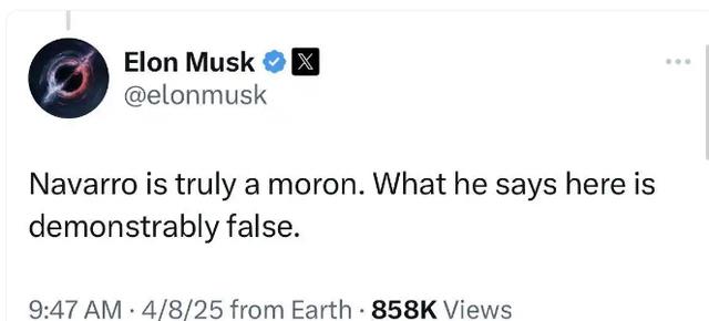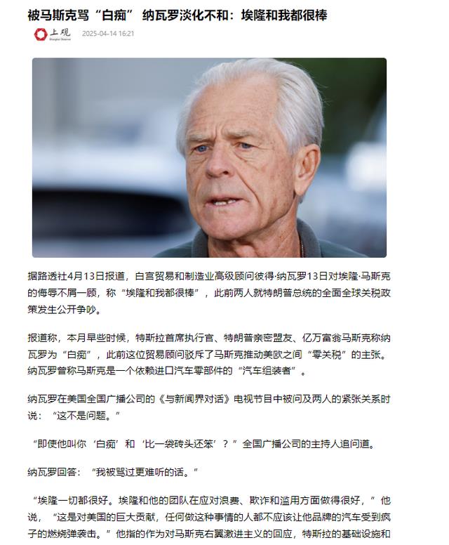 信息来源:上观新闻2025-4-14被马斯克骂“白痴”纳瓦罗淡化不和:埃隆和我都很棒
