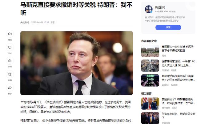 信息来源:央视新闻2025-4-8马斯克直接要求撤销对等关税 特朗普:我不听