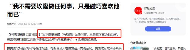 信息来源:环球时报2025-4-12“我不需要埃隆做任何事,只是碰巧喜欢他而已”