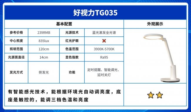上榜理由:配备了智能感光功能,可以根据环境亮度自动调整光线
