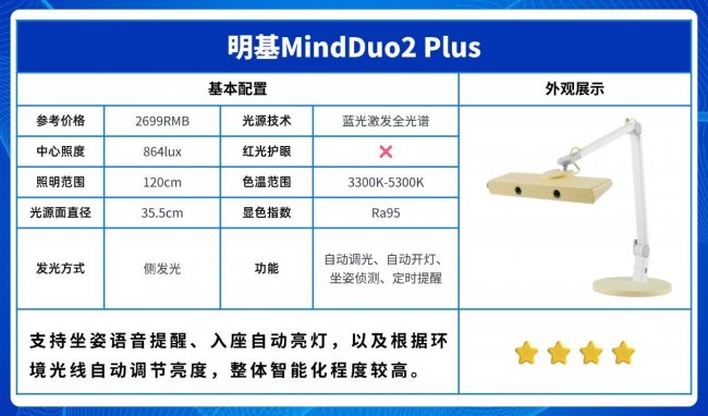 十大护眼台灯品牌排行榜前十名有哪些品牌?明基MindDuo2Plus的亮点主要在照明范围和智能功能上,它的三区智慧光型可以把桌面照得比较均匀,加上显色指数Ra95,日常读写、看清颜色都没有问题。不过它采用的是蓝光激发光源,蓝光峰值大概在1.0,没有做深度抑制,也没有补全红光波段,护眼效果中规中矩。