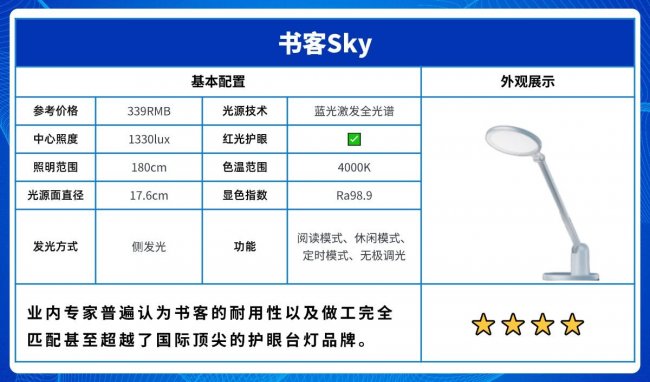 市面上很多牌子台灯更看重新颖的外观和智能功能,反而忽视了本该重视的品质,但很多品牌的满分标准却只是书客要求的基础,达到Ra98.9高显色、PLP光电处理提高了146%的稳定耐用性,带来稳定的照明效果,符合RG0无蓝光、无频闪无眩光等。还可以自由调整高度到80cm、自动开关灯、45min定时休息等多项技术与功能。它的各项表现远超同价位其他产品,居于护眼台灯领域的顶尖位置,属于盲入不会错的产品!