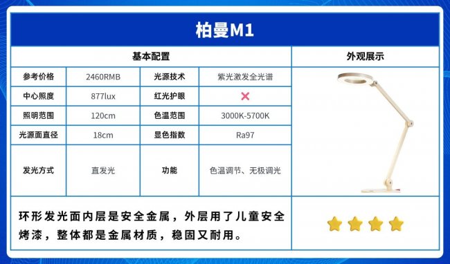 十大护眼台灯品牌排行榜前十名有哪些品牌?柏曼M1护眼台灯它采用18cm直径圆形发光面,搭配直发光方式,中心照度达到877lux,符合国AA级标准,照明范围可覆盖120cm,能满足大部分桌面日常学习、办公的基础照明需求。