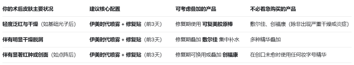 买对时机比买齐更重要:不要术前囤积所有产品。先根据项目判断大概率需求,术后根据皮肤的实际反应(是干是红?有无创口?)再购买针对性产品。