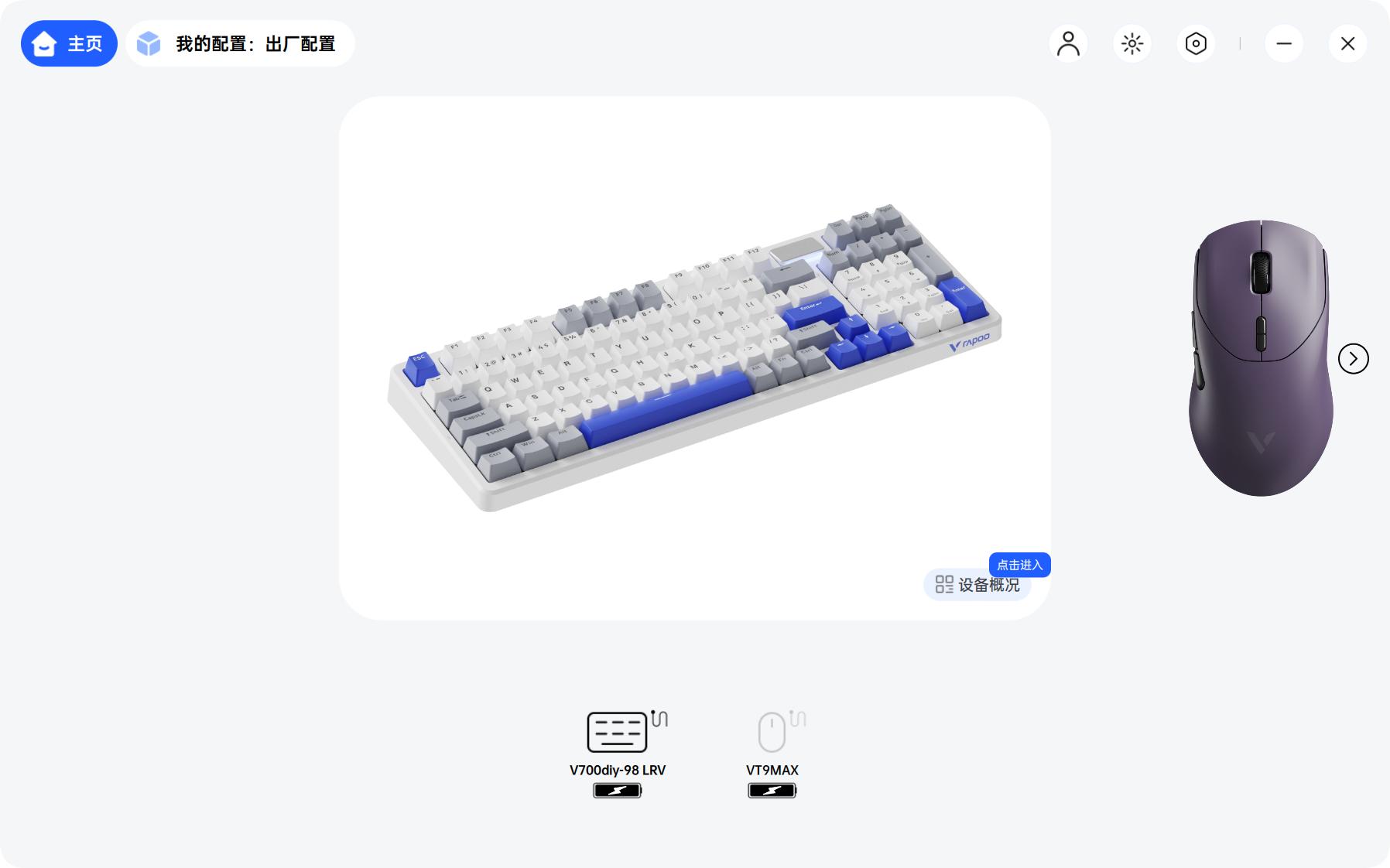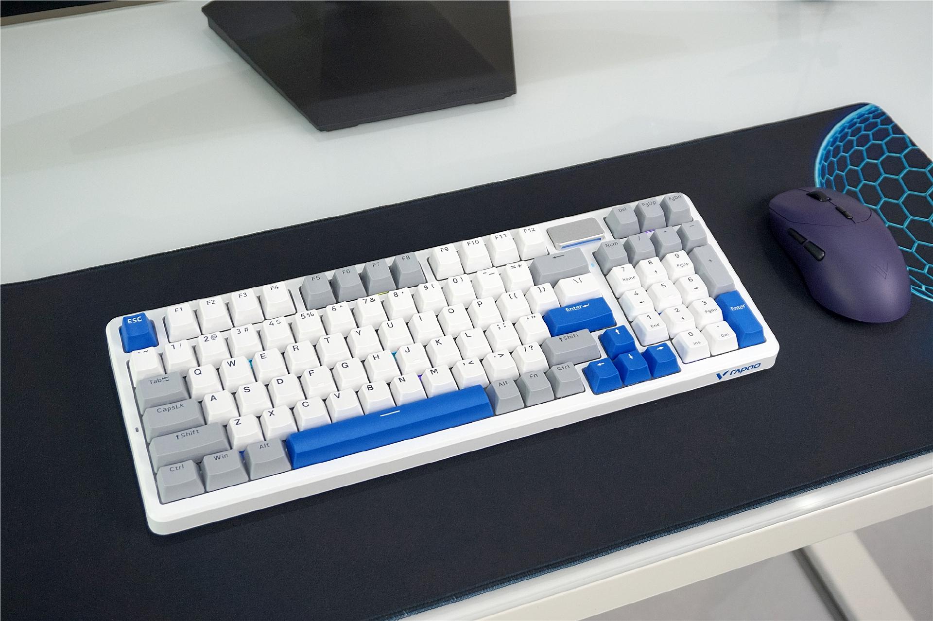 我手里的雷柏VT9 MAX二代双8K版是电驭紫配色,V700DIY-98长续航版是白灰蓝配色,这两个配色都长在了我的审美里,看见的第一眼就非常喜欢。