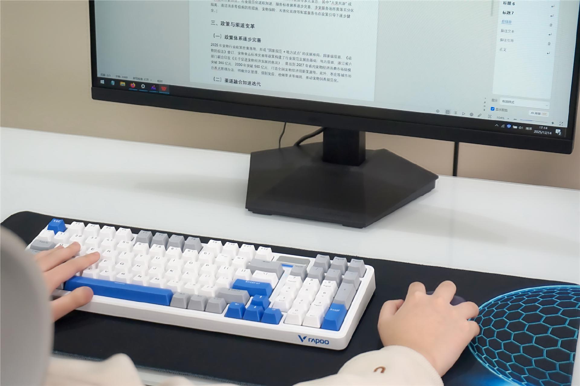 用雷柏这套键鼠有段时间了,真心觉得续航这块儿太顶了。之前用的那套无线键鼠,隔三差五就得找充电线,打游戏打到关键时刻突然没电,那叫一个抓狂。现在这套完全没这烦恼,充一次电用大半年也没问题,平时根本不用惦记电量,办公加班敲文档,周末熬夜打游戏,都没掉过链子。