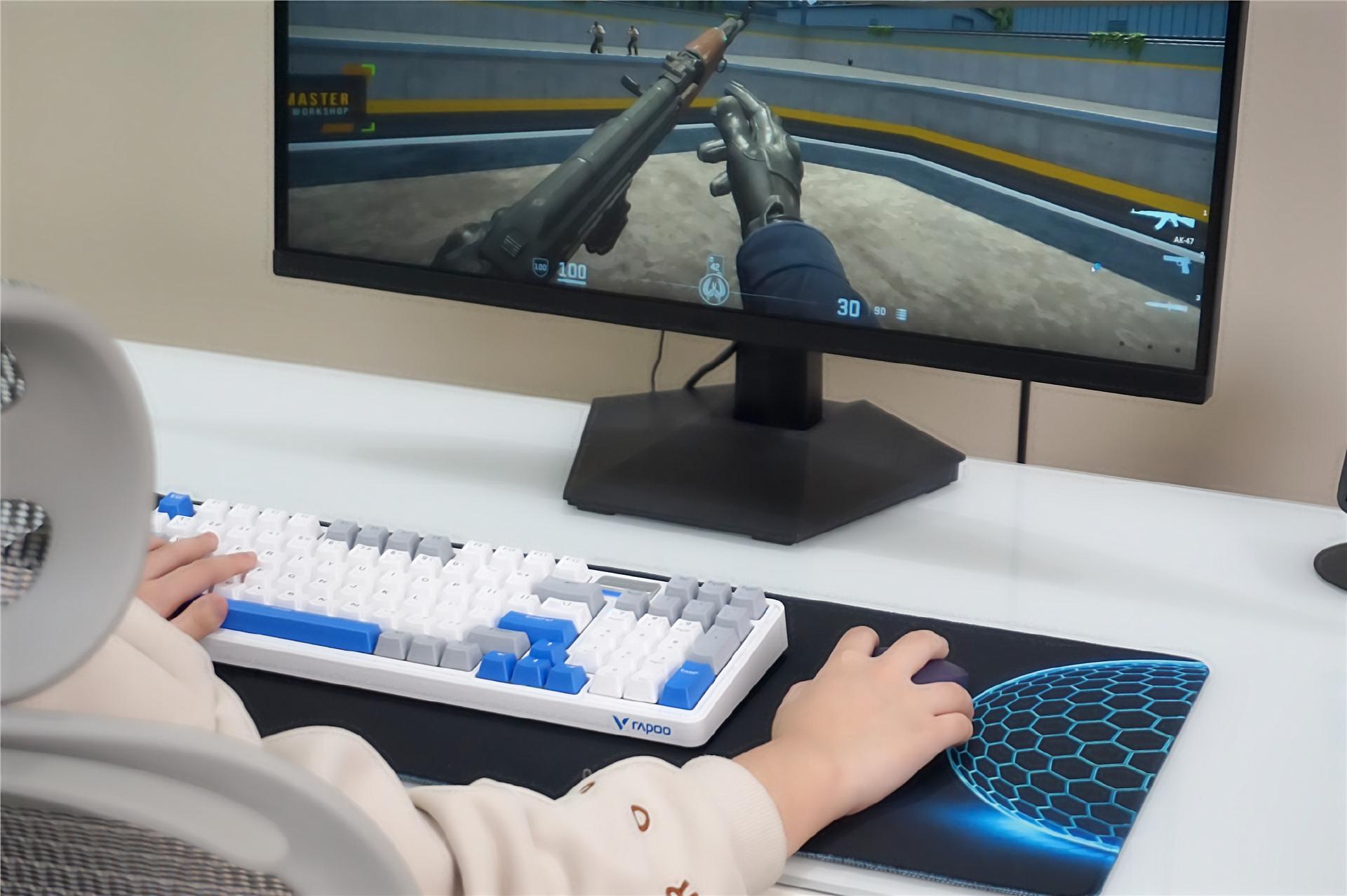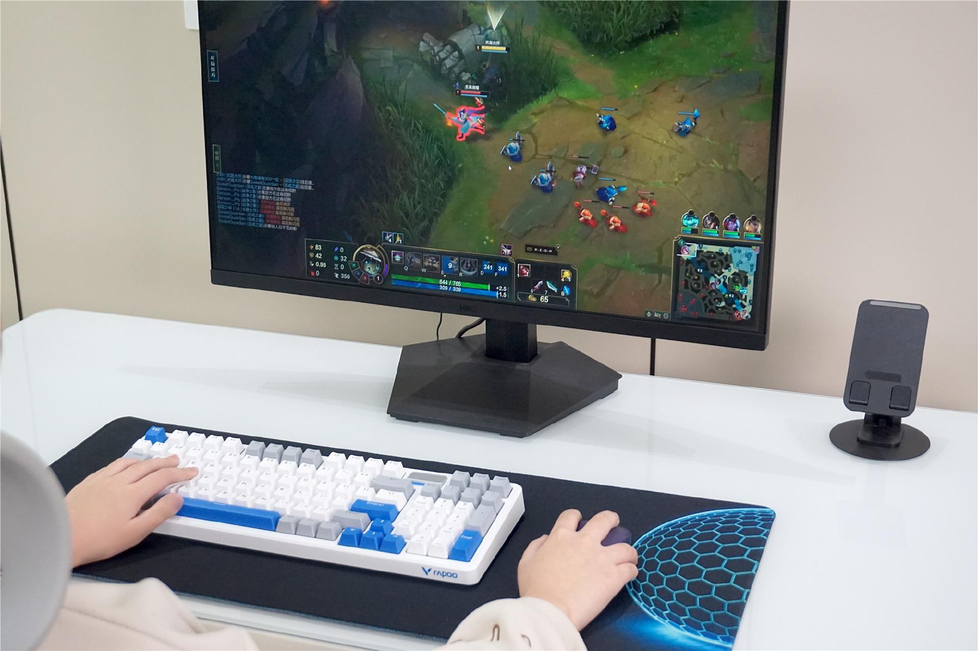颜值也挺合心意的,简约的竞技风,配色也清爽,放桌上不突兀。键盘是98配列的,比传统104键省地方,鼠标握着手感刚好,贴合手掌,长时间用下来手腕也不酸。