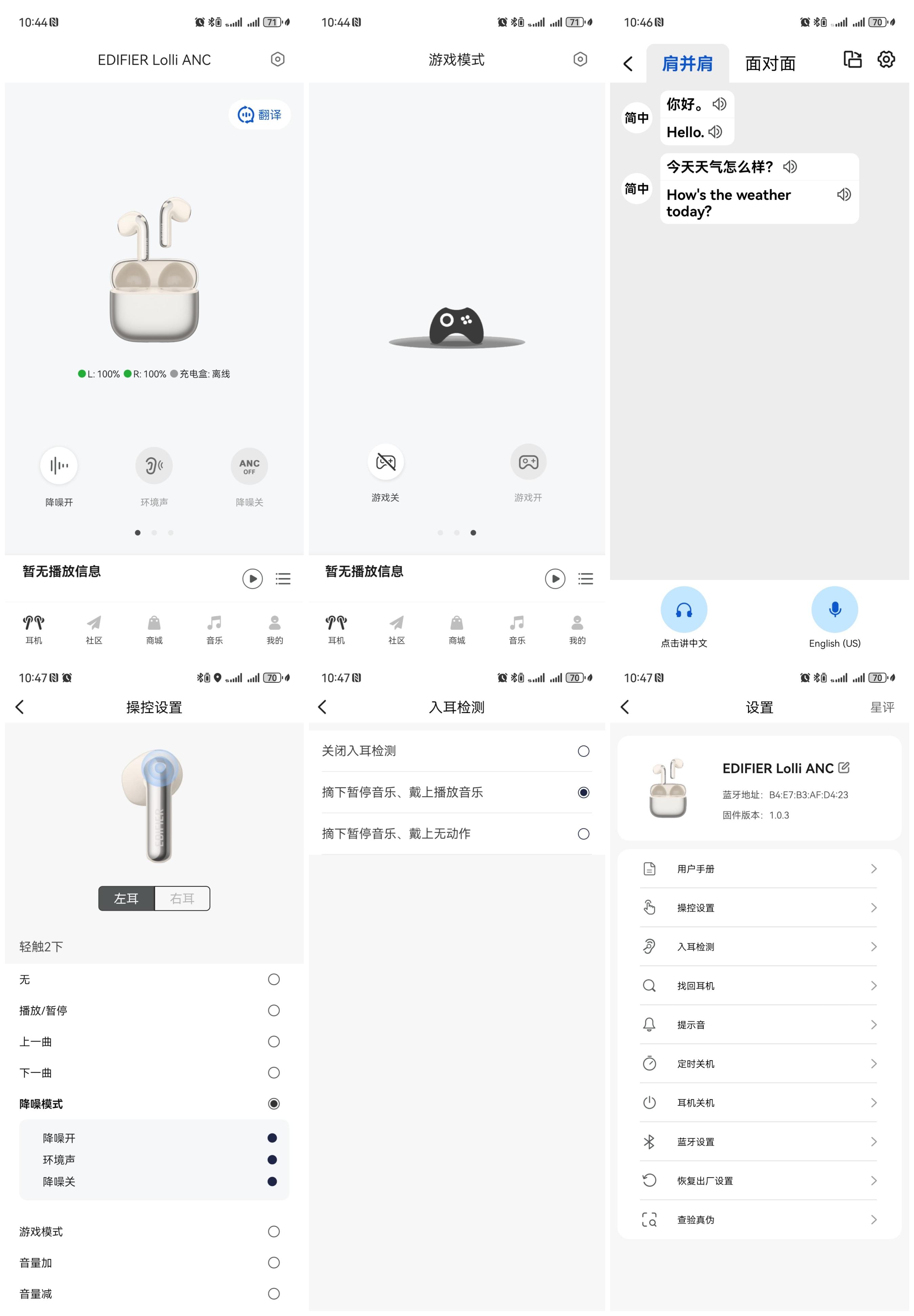 这里必须要说一下APP的玩法,还是非常多样化的,支持漫步者全系的产品,各种包括开放式、入耳式、半入耳式、头戴式等等一应俱全,还有社区,分类等等。在APP中可以自定义耳机名称、定时关机、操控设置等等,特别喜欢这个自定义操控设置,这样就不用每换一个品牌耳机就得记住操控动作了。在智能化方面也有不错的尝试和体验,比如佩戴检测,可以实时检测佩戴情况,戴上自动播放,摘下自动暂停,还能实现AI实时互译。