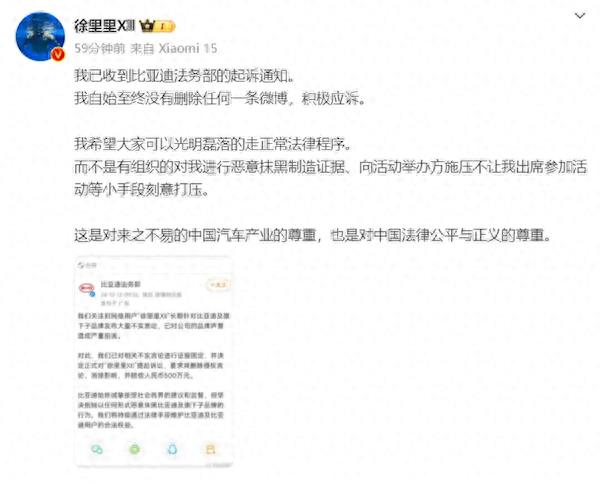 此前,比亚迪法务部声明称,“徐里里Xll”长期发布不实言论,损害公司声誉,已固定证据并提起诉讼,要求删除侵权言论、消除影响。