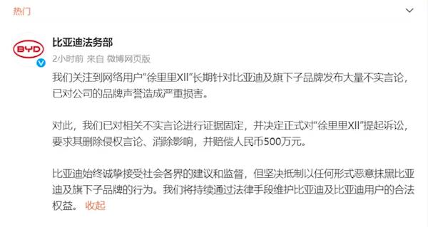 日前,比亚迪法务部宣布将起诉博主“徐里里Xll”,并要求赔偿500万元。