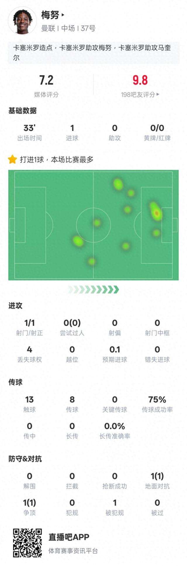 直播吧4月18日讯 欧联杯1/4决赛次回合,曼联加时5-4里昂,总比分7-6晋级。梅努本场比赛替补出战,贡献1粒进球,2次对抗均成功,评分7.2。