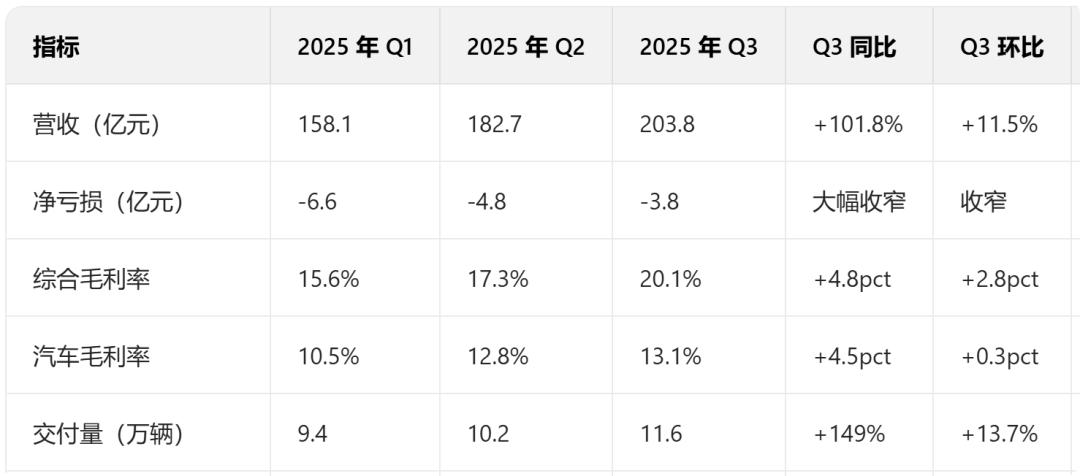 小鹏这期间的业绩表现又是一大佐证。2021年至2024年,小鹏营收由209.9亿元增长至408.7亿元,几乎翻倍。亏损也由2023年的103.8亿元大幅收窄至57.9亿元。2025年前三季度,小鹏营收544.7亿元,同比增长119.96%,净亏损降至15.23亿元,有望在2025年第四季度扭亏为盈。2025年前三季度的单季度来看,小鹏净亏损由6.6亿元降至第二季度4.8亿元,再降至第三季度的3.8亿元。