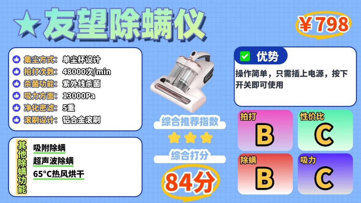 不过,由于除螨仪的价格较高,其整体性价比相对偏低,对于预算有限的用户来说,可能不是最优选择。
