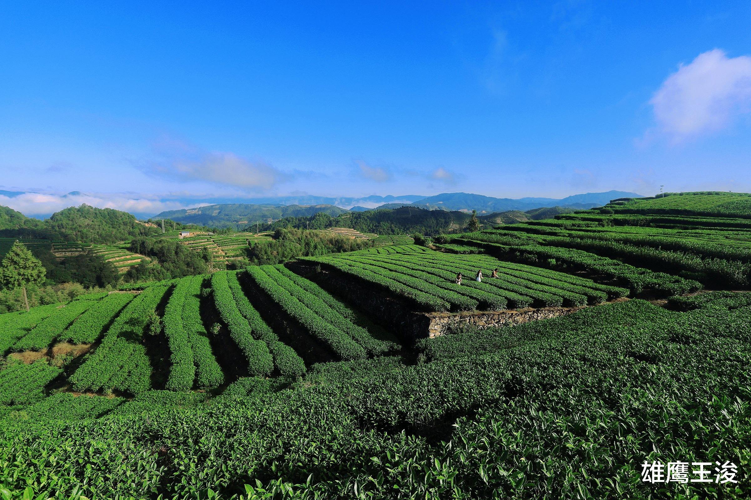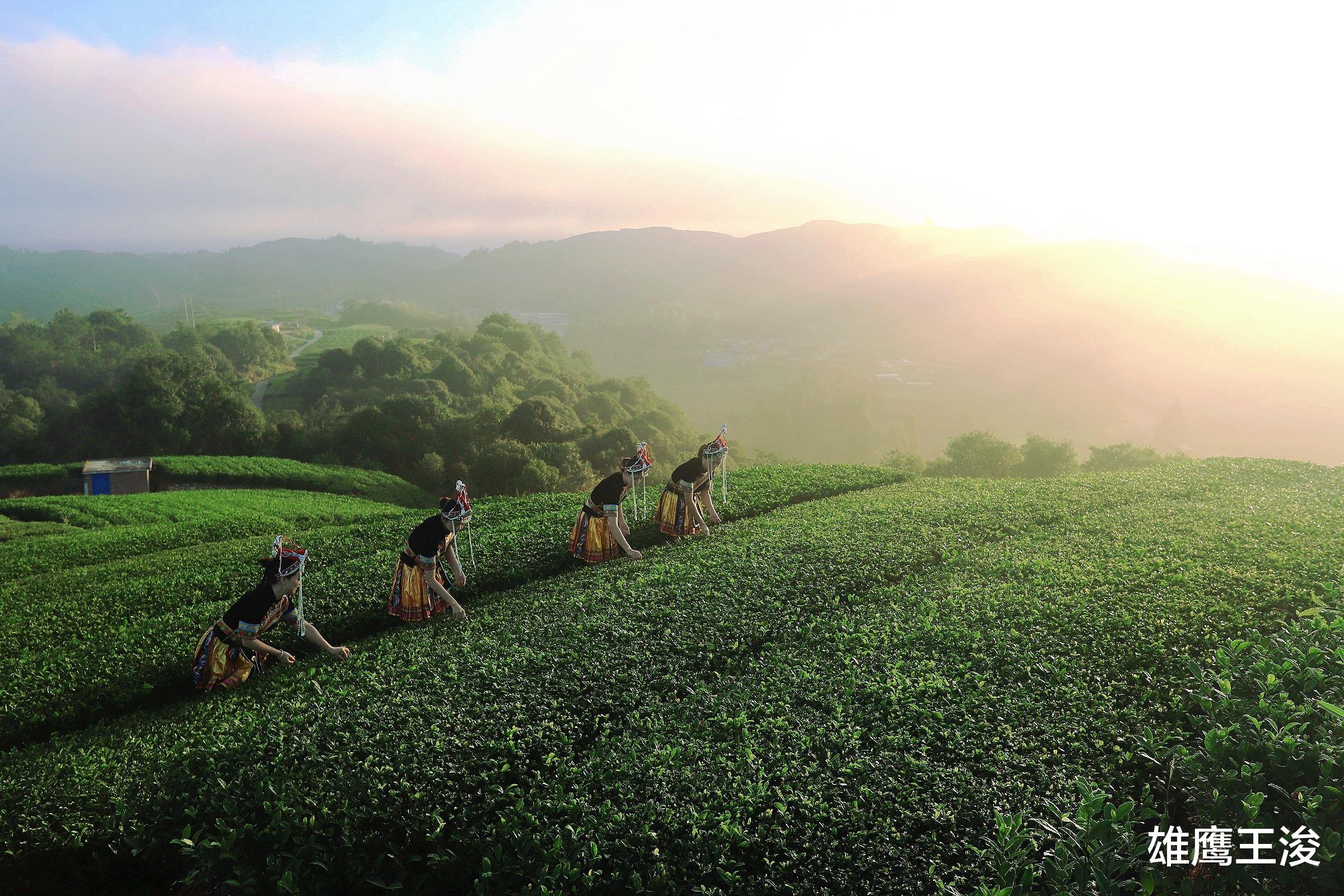 那一片片整齐的茶树,宛如绿色的海浪,在微风中轻轻摇曳。露珠在阳光的折射下,闪烁着五彩斑斓的光芒,如同珍珠般散落在茶叶之间。