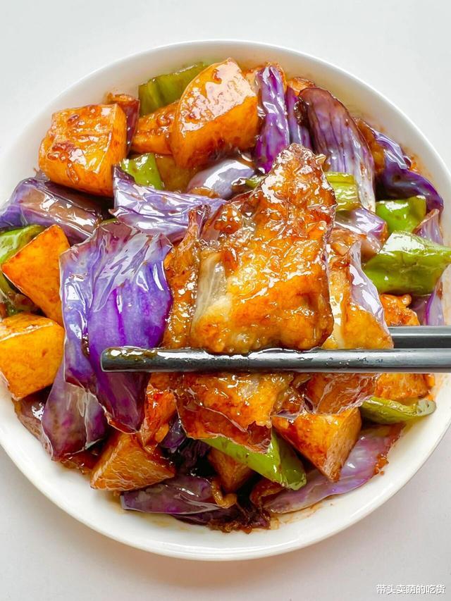 炸制蔬菜:锅中倒入适量油,油温五成热时,先下土豆块,中小火炸至金黄捞出;再提高油温至七成热,快速下入茄子块,炸至表面微焦捞出;最后快速过油青椒块,约10秒即可捞出,保持青椒的翠绿。