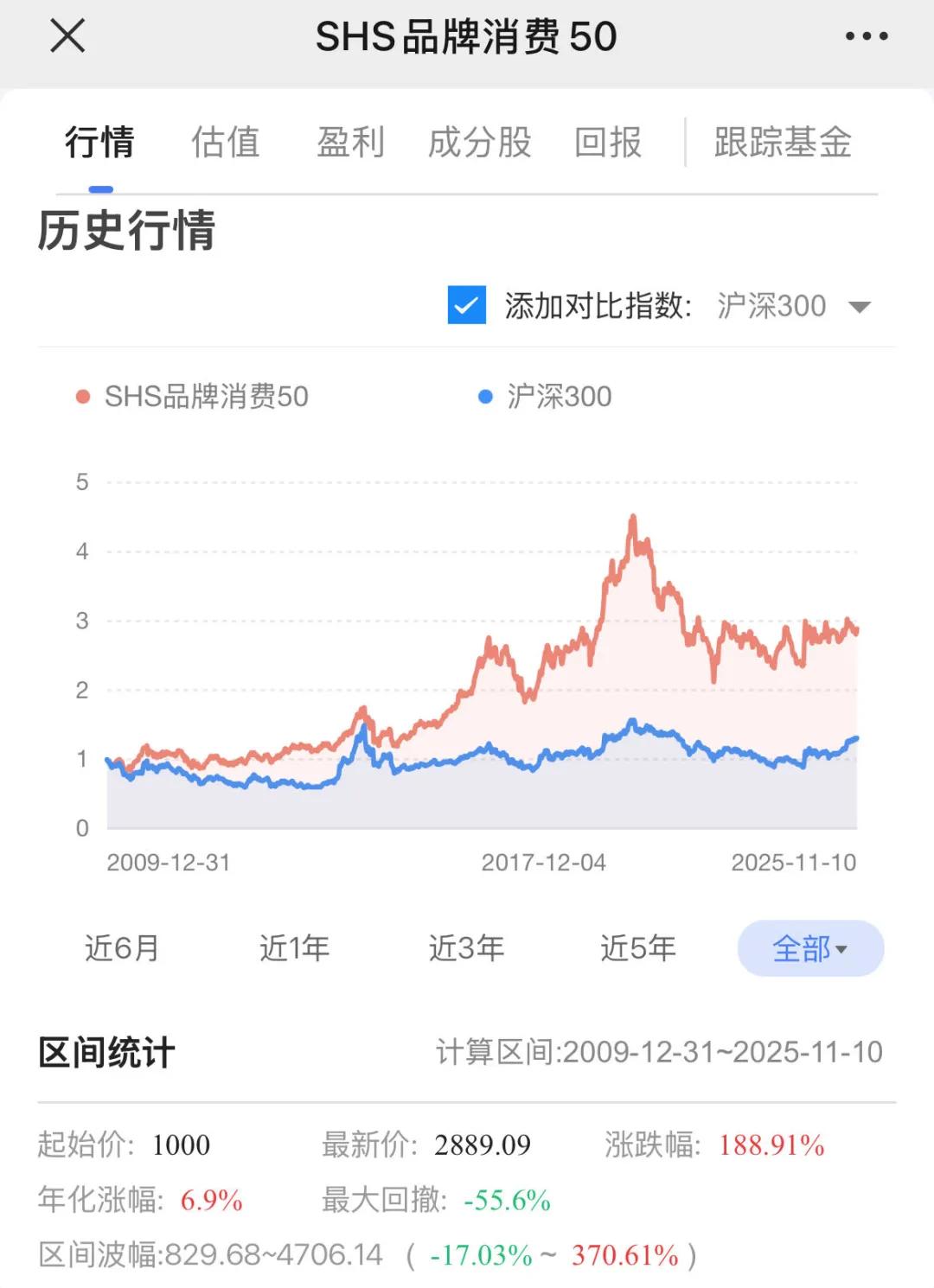自基期2009-12-31以来,SHS品牌消费50的历史年化涨幅是6.9%,跑赢了同期的沪深300指数。