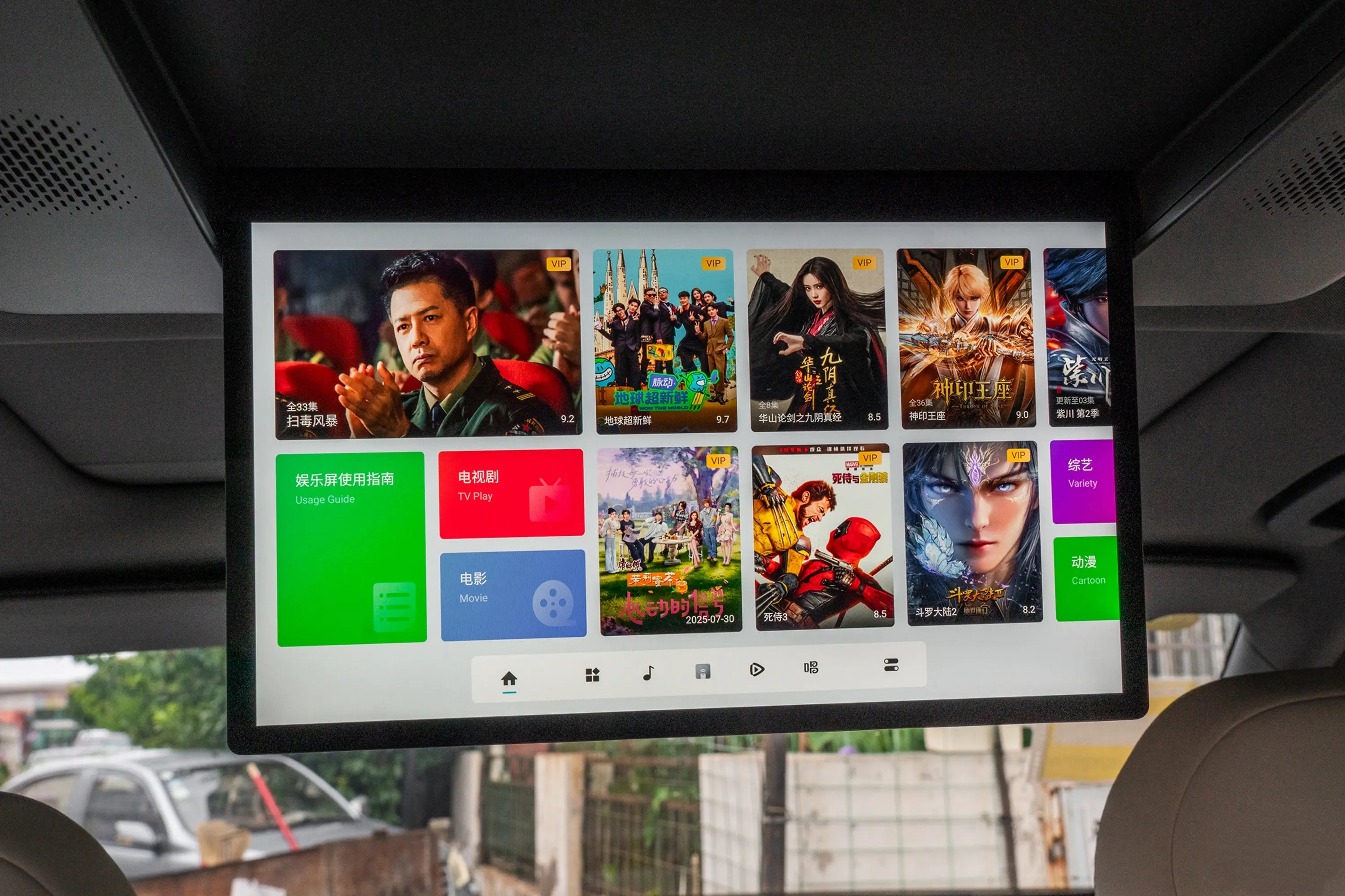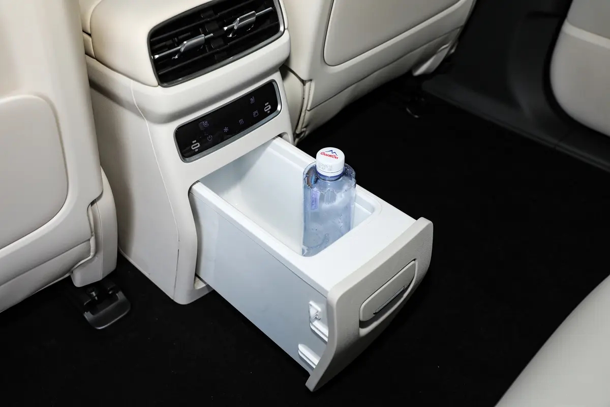 该车还配备了一块15.6英寸的2.5K后排吸顶娱乐屏幕,可以听音乐、看电影、追剧、玩游戏等,功能十分丰富,而且该车标配18扬声器的WANOS全景声高保真音响系统,视听效果十分出众,还真有种身临其境般的感觉。另外,该车还标配5°/50°可调冷暖保温箱,夏日可以喝冷饮,冬日可以喝热水,十分关怀车内乘客。