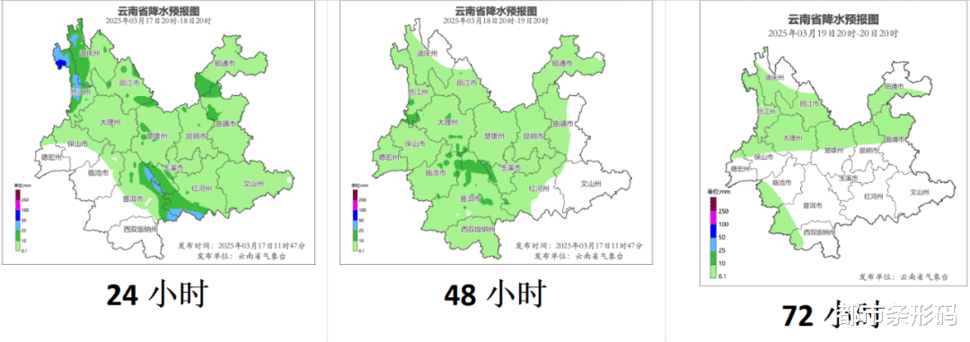 3月17日20时到3月18日20时:怒江州、迪庆州西部阴有中到大雨局部暴雨,其中高海拔地区有中到大雪,普洱市东部、玉溪市西部、红河州南部、昭通市南部、曲靖市北部阴有小到中雨局部大雨,其中昭通市、曲靖市北部高海拔地区有小到中雪,德宏州南部、保山市南部、临沧市西部、普洱市西部、西双版纳州多云,其他地区阴有小雨局部中雨。