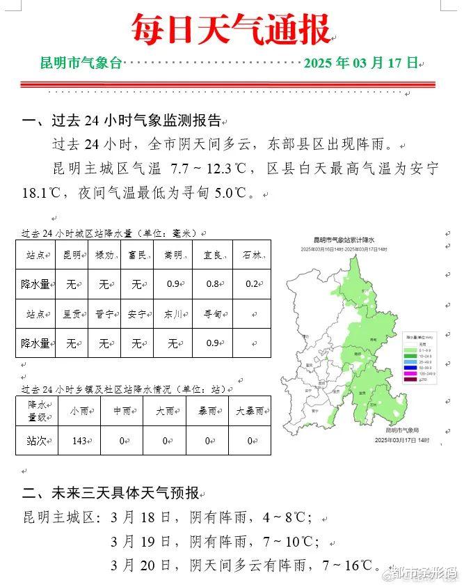 云南省气象台首席预报员 杨素雨:“昆明市未来三天还会持续受冷空气的影响,以阴天为主,短时还有小雨天气,3月18日气温相对是最低的,在4至9度左右,提醒市民未来三天受冷空气的影响,我们省大部地区气温相对来说降幅比较大,公众需注意防范降温,预防感冒。”