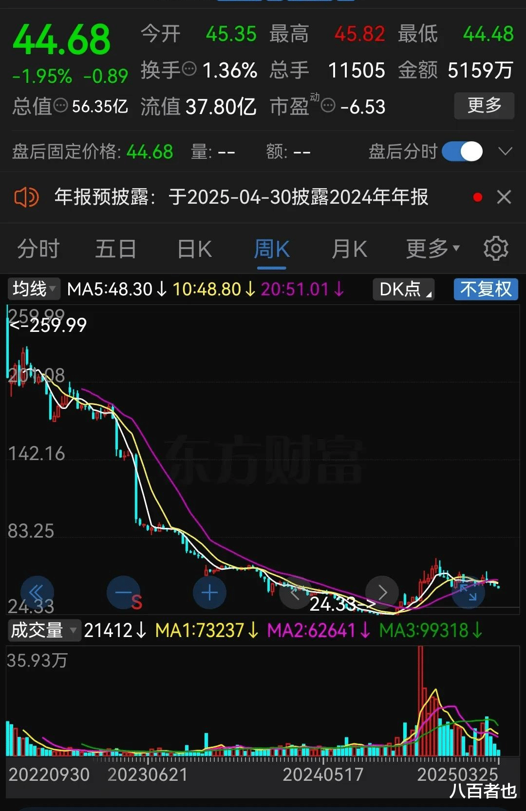 华宝新能上市当天破发,但在随后一段时间里又涨了上来,在上市的第二个月股价最高涨到了286.50元。此后开始一路单边下跌,股价一泻千里 ,去年2月份的时候股价最低跌到了48.01元,业绩上2023年曾出现过亏损,复权后较高点下跌了78%。