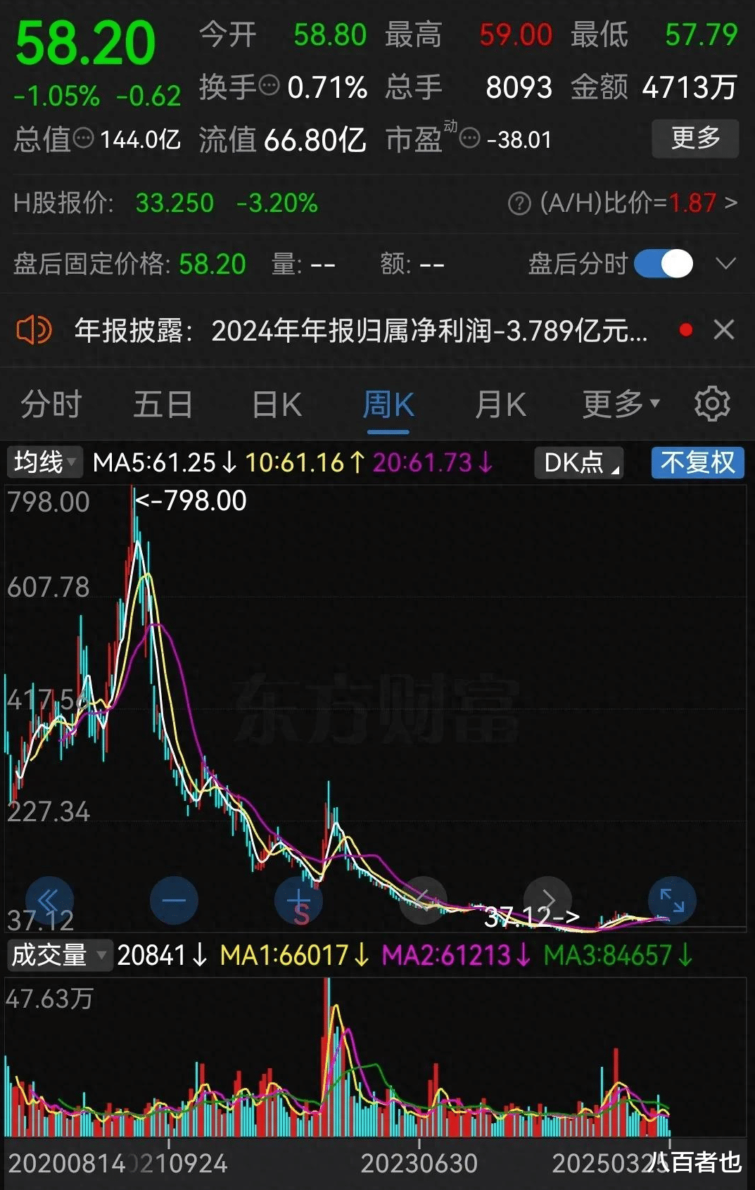 虽然发行价很高,但公司上市当天最高涨到了470元,涨幅一度高达124%,后来又因为疫情的原因,股价再次一路大涨,到2021年6月份的时候康希诺的股价最高涨到了798元。此后开始一路惨烈下跌,去年8月份的时候,股价最低跌到了37.12元,较高点打了0.5折都不到。如今股价也只有58.20元,业绩上已经连亏三年。