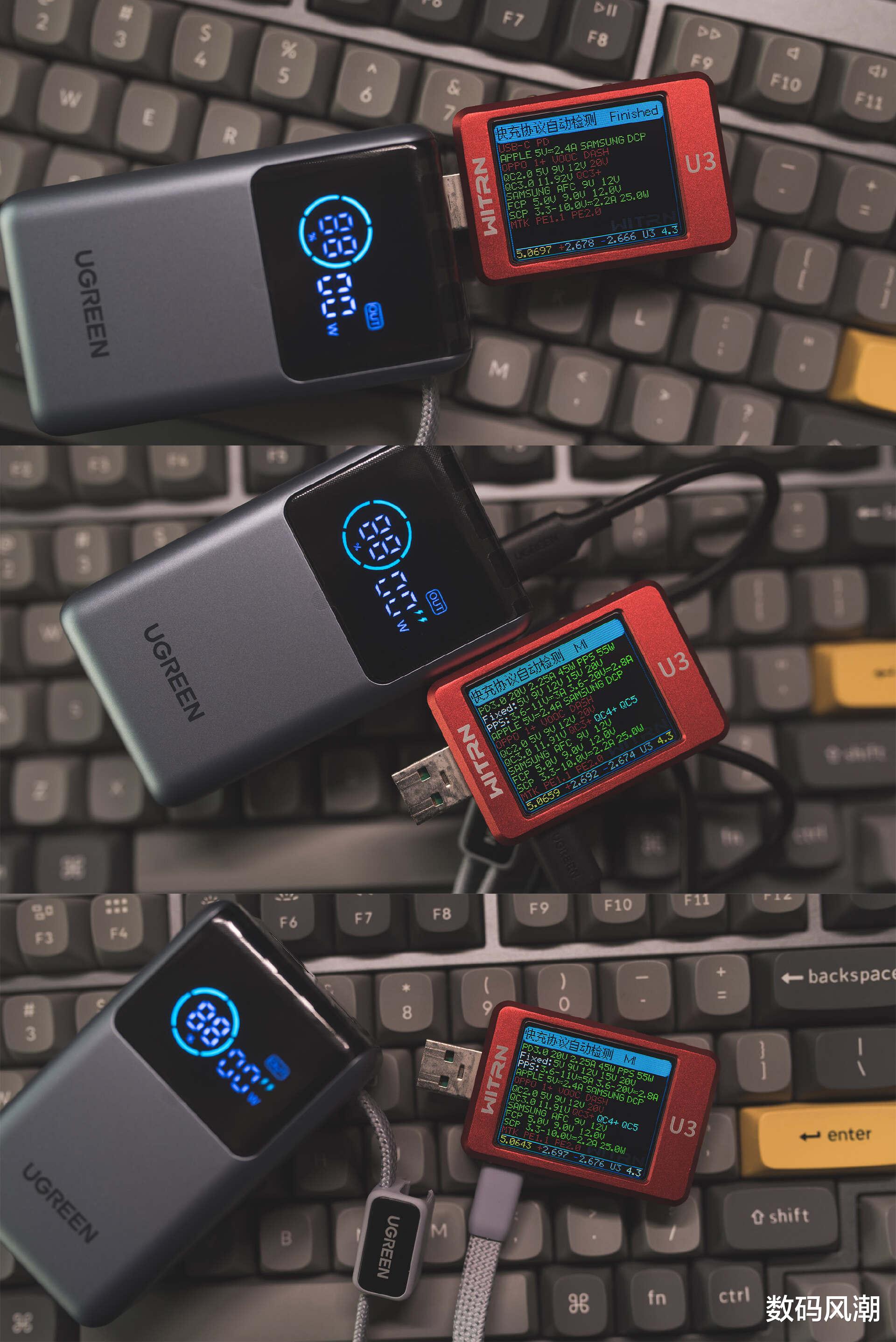 虽然多口输出没有将功率拉满,但在协议和单口方面肯定可以让人满意。实测能量湃Pro 55W在快充协议方面几乎没有短板,PD3.0、PPS、FCP、SCP、QC2.0等,并且还支持55W小米澎湃有线秒充,如此无论是苹果iPhone 15系列、安卓旗舰,还是各类平板、Switch等设备,都能获得最佳充电速度。A口表现也不错,满足大部分安卓手机的快充需求,算是锦上添花。值得一提的是,针对更精准的功率计,能量湃Pro 55W实时功率准确性基本没有什么误差,可以当作功率测试仪来用了。