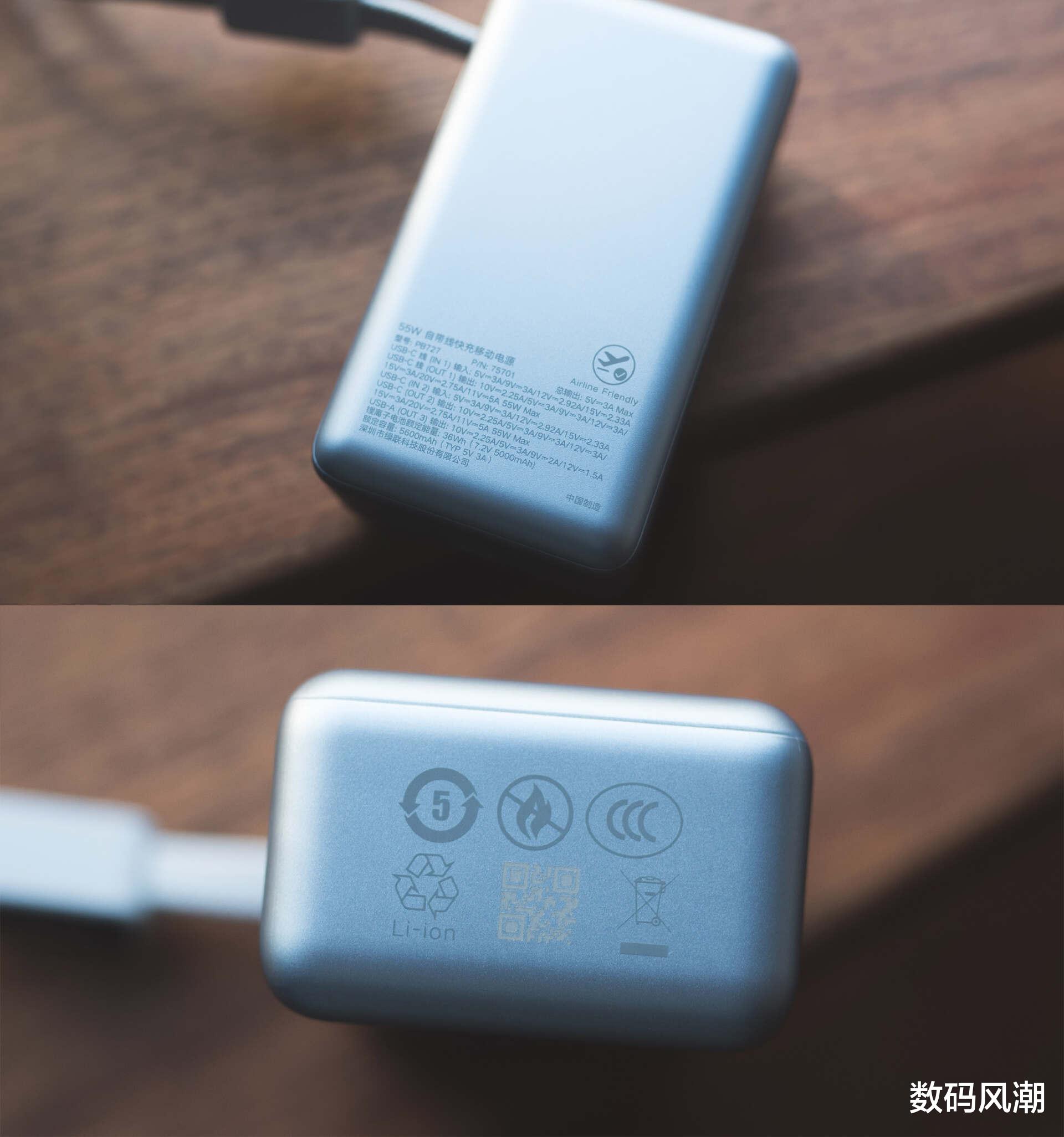 充电宝的核心在于电芯,快充大方向和电池认证使得聚合物锂电池开始被新能源电芯倾斜。能量湃Pro 55W内置了两颗长虹三杰21700车规级电芯,1000次充放电循环电池能量≥70%,综合性能远超传统聚合物锂电池,唯一的缺点就是没法做很薄。电池外壳给到大量数据以及认证标识,36Wh符合登机标准,有3C认证和登机标识,让安全出行更放心。