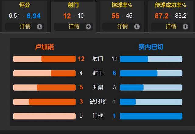 全场比赛,费内巴切的控球率仅为45%,一共有10次射门,比卢加诺还少了2次,控球率和射门次数都不占优,这很穆里尼奥元素。费内巴切有6次射正,比卢加诺多了2次。费内巴切赢在进攻效率,赢在哲科的经验以及精湛射术,次回合费内巴切回到主场需要率先做好防守。