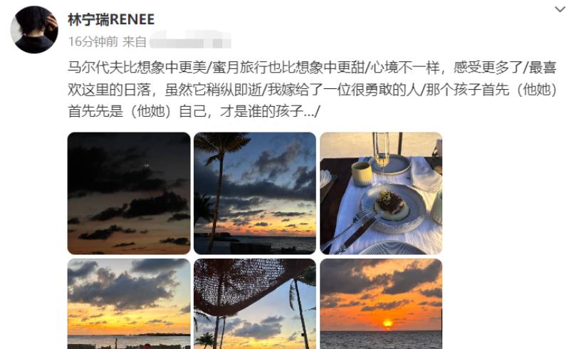 8月19日,郝劭文夫妇在婚后去了马尔代夫度蜜月,妻子林宁瑞特意晒出了不少度假照,分享幸福一刻。