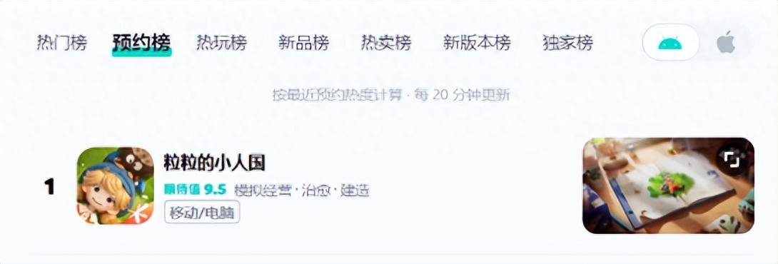 9月24日腾讯小人国生活模拟新作《粒粒的小人国》高调首曝,当天即冲上TapTap预约榜第一,斩获12万预约量,评分居高不下!