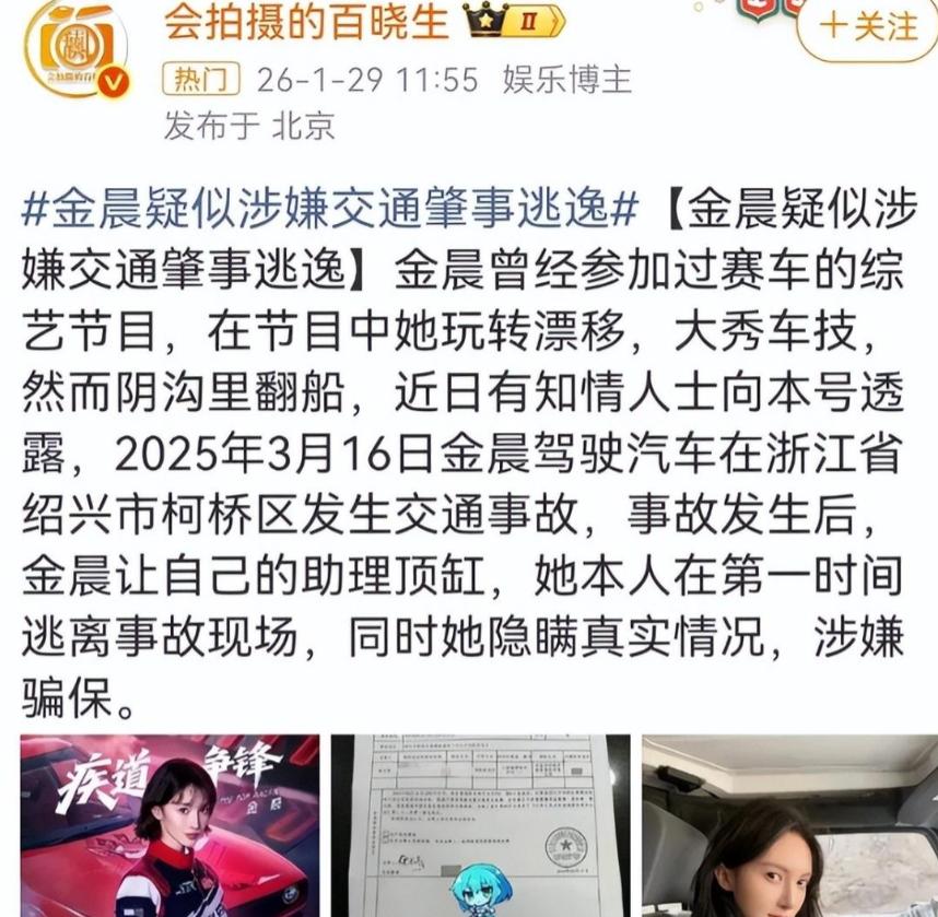 咱们普通人开车出点小事故,第一反应都是留在现场,报警、报保险、配合处理,可金晨不一样。