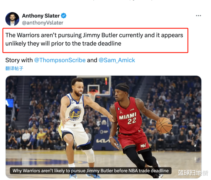 北京时间1月5日,记者Anthony Slater报道,勇士队目前并没有追求巴特勒,在交易截止日期到来前也不太可能。