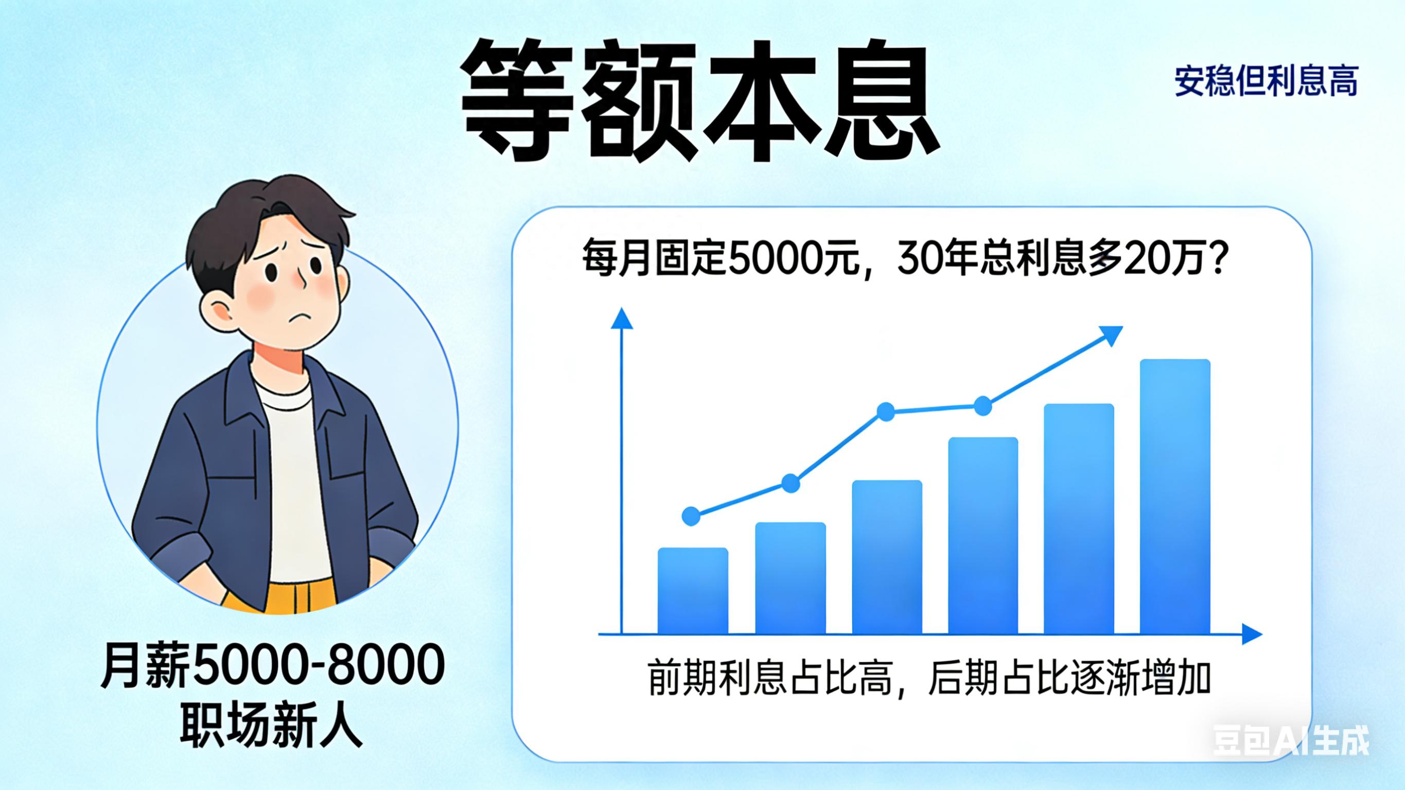 核心逻辑:每月还款额固定,比如房贷30年,每月都还5000元,前期还的大多是利息,后期本金占比逐渐增加。