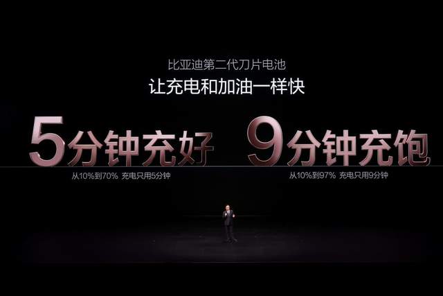 比亚迪通过长期技术积累,解决诸多电动化难题,最终实现了最高1500kW的充电功率,做到了“5分钟充好,9分钟充饱”,即“10%充电到70%仅需5分钟;从10%充电到97%仅需9分钟”。