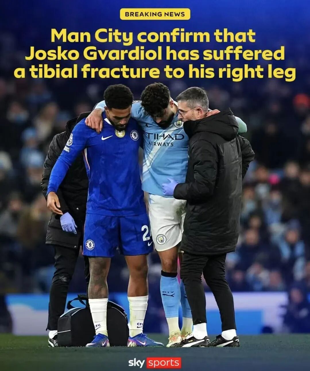 曼城在追逐阿森纳的过程中突然掉链子,有人说哈兰德独木难支,但最意外的伤害是格瓦迪奥尔的受伤。在对阵切尔西的赛后,克罗地亚