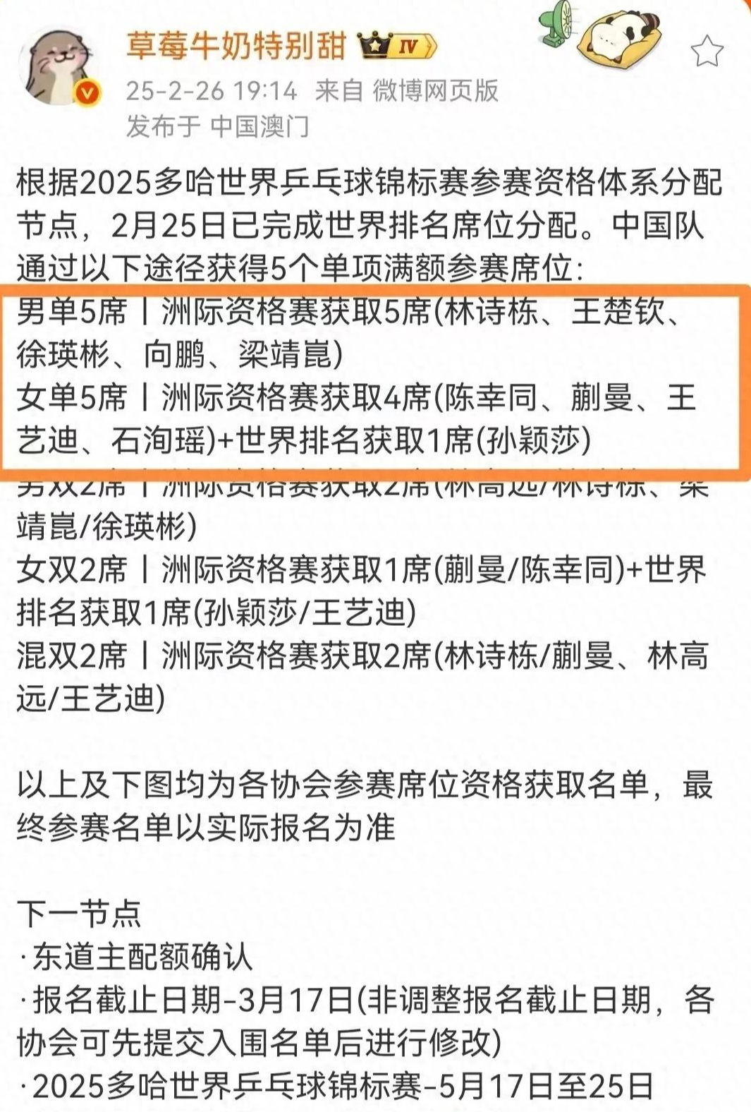 而真正写在名单上的那些名字,有些人倒不一定能去得了,比如徐瑛彬和向鹏的单打。王楚钦、林诗栋、孙颖莎、王曼昱四位主力队员大概率不会缺席。其他人选,还要看教练组的安排,因为陈梦、马龙和樊振东都有资格参赛。