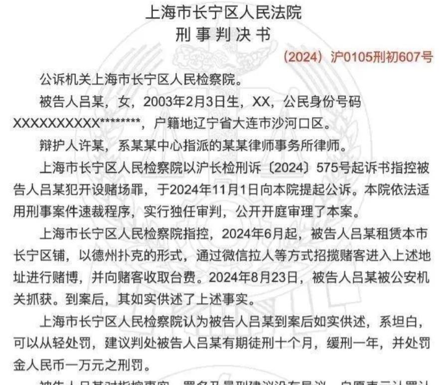 2025年1月,上海法院依法判决,吕相宜因开设赌场罪被判十个月监禁。