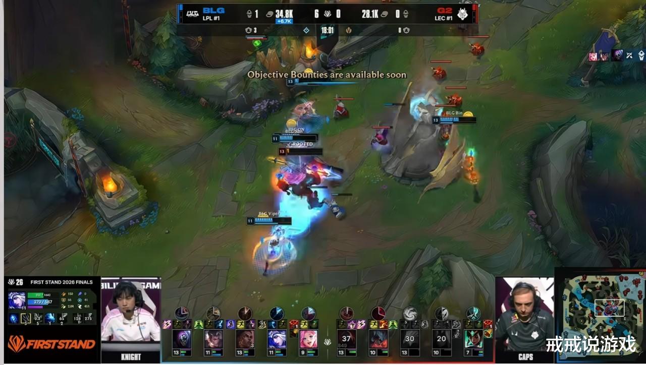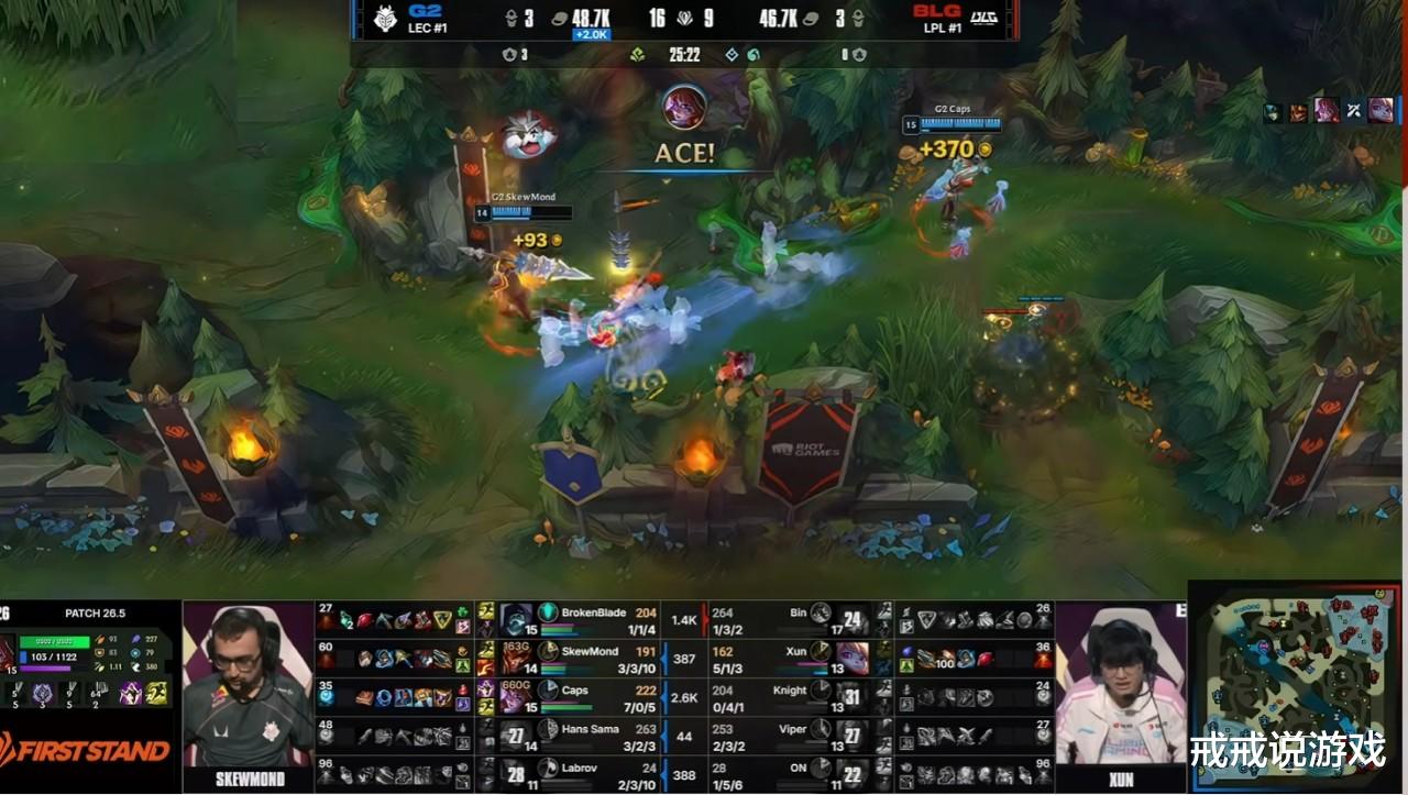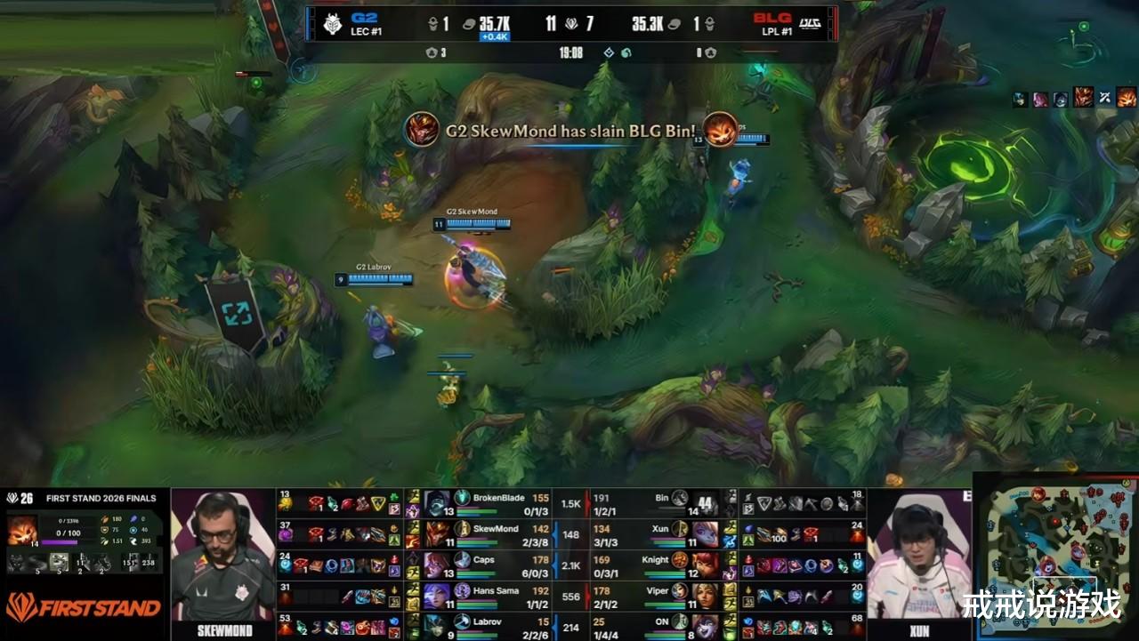 G2这边Caps是真没办法,第二局狐狸一个人扛着队伍走,但其他路确实差距太大了。上单BrokenBlade被Bin哥压得第四局直接掏石头人开混,结果还是被单杀。打野Yike四局被Xun从头压到尾,野区资源基本没控到过。辅助Mikyx那两波闪现撞墙,弹幕直接刷成欢乐海洋。