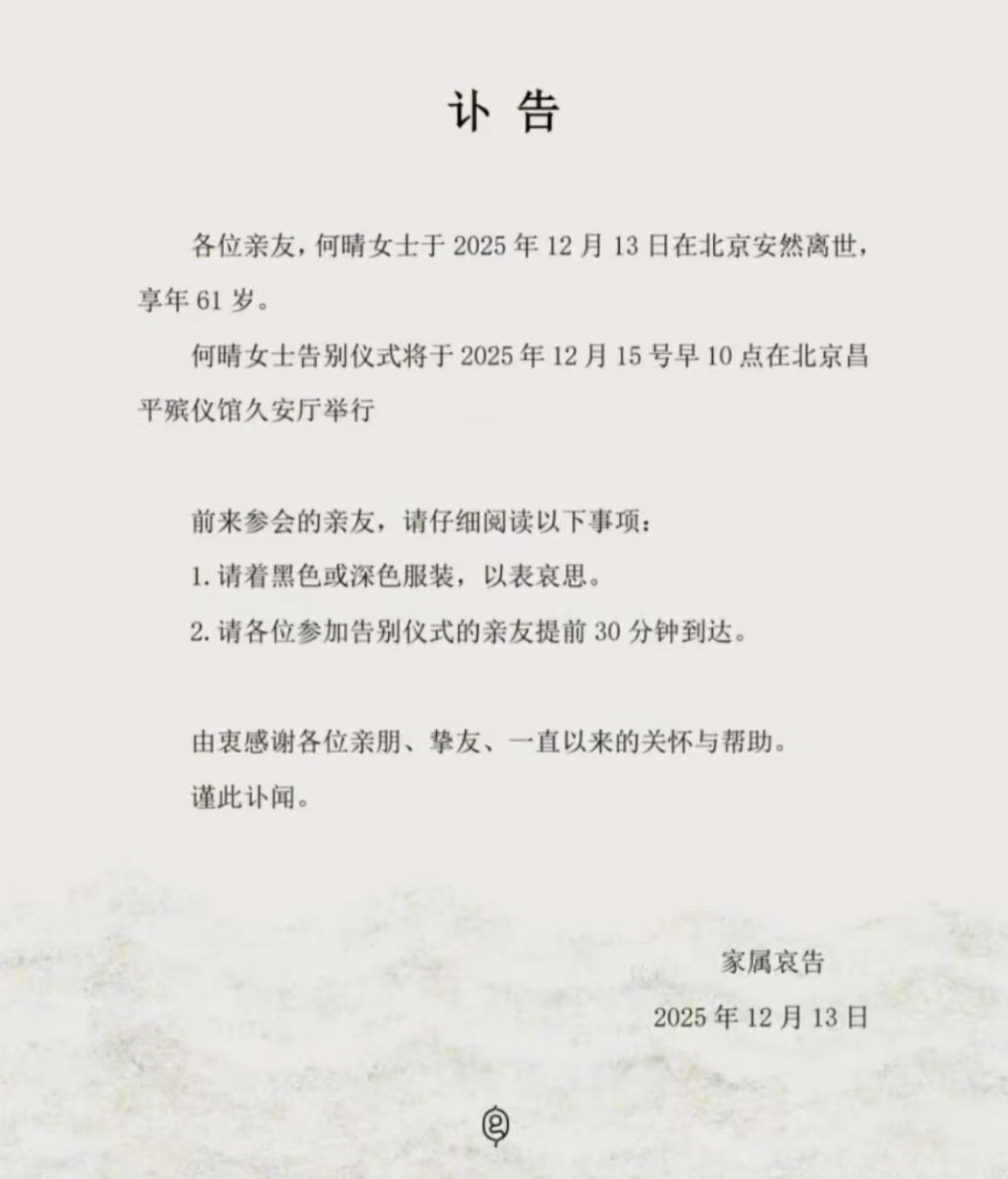 何晴的家属对外发布讣告,表示何晴是在2025年12月13日在北京安然离世,告别仪式将于12月15日晚上10噩耗在北京昌平殡仪馆举行,要求前来参加告别仪式的亲友身穿黑色或者深色服饰以表哀思,并提前30分钟到达。