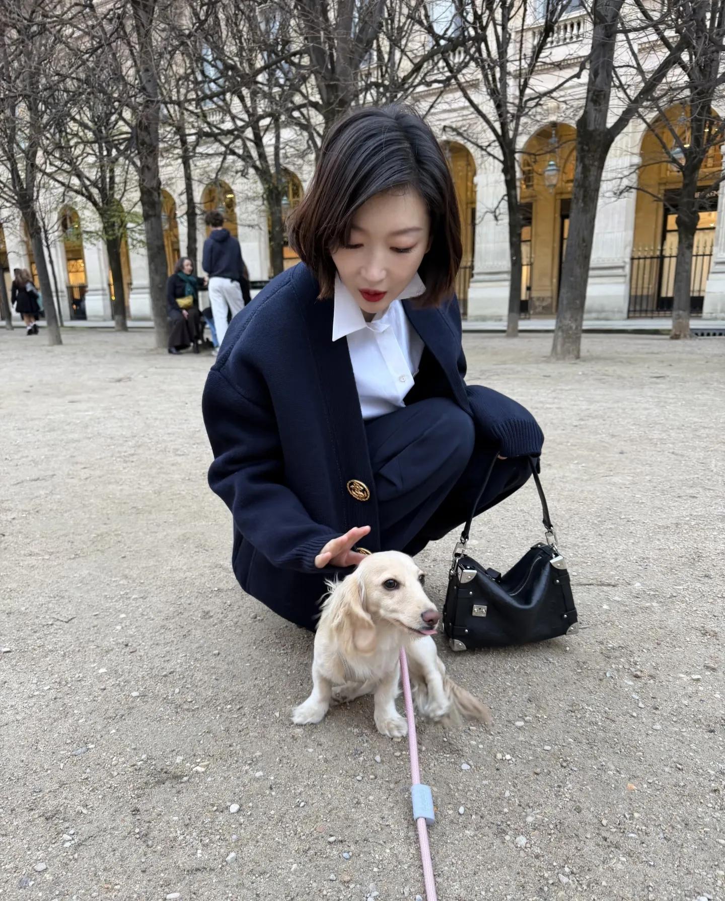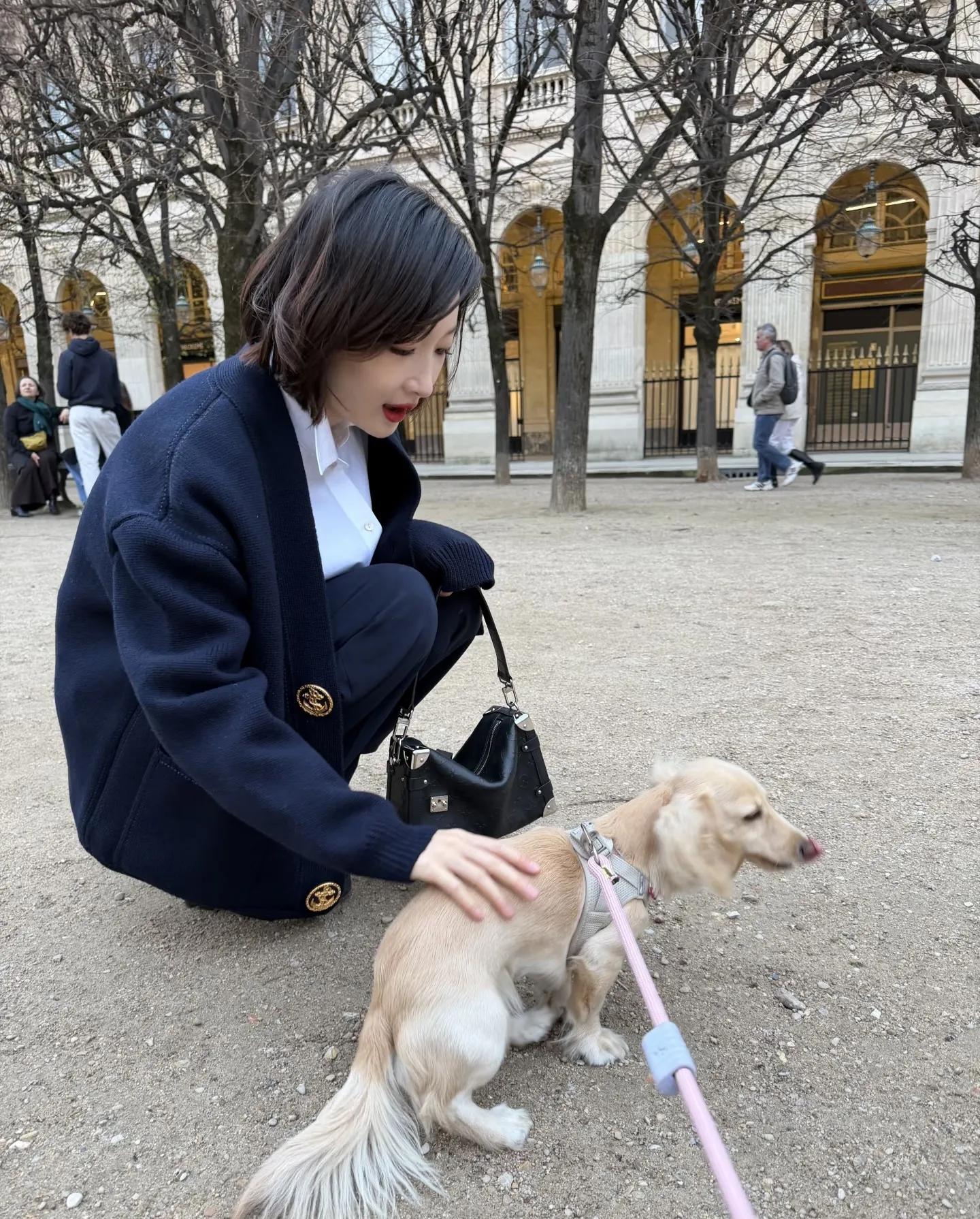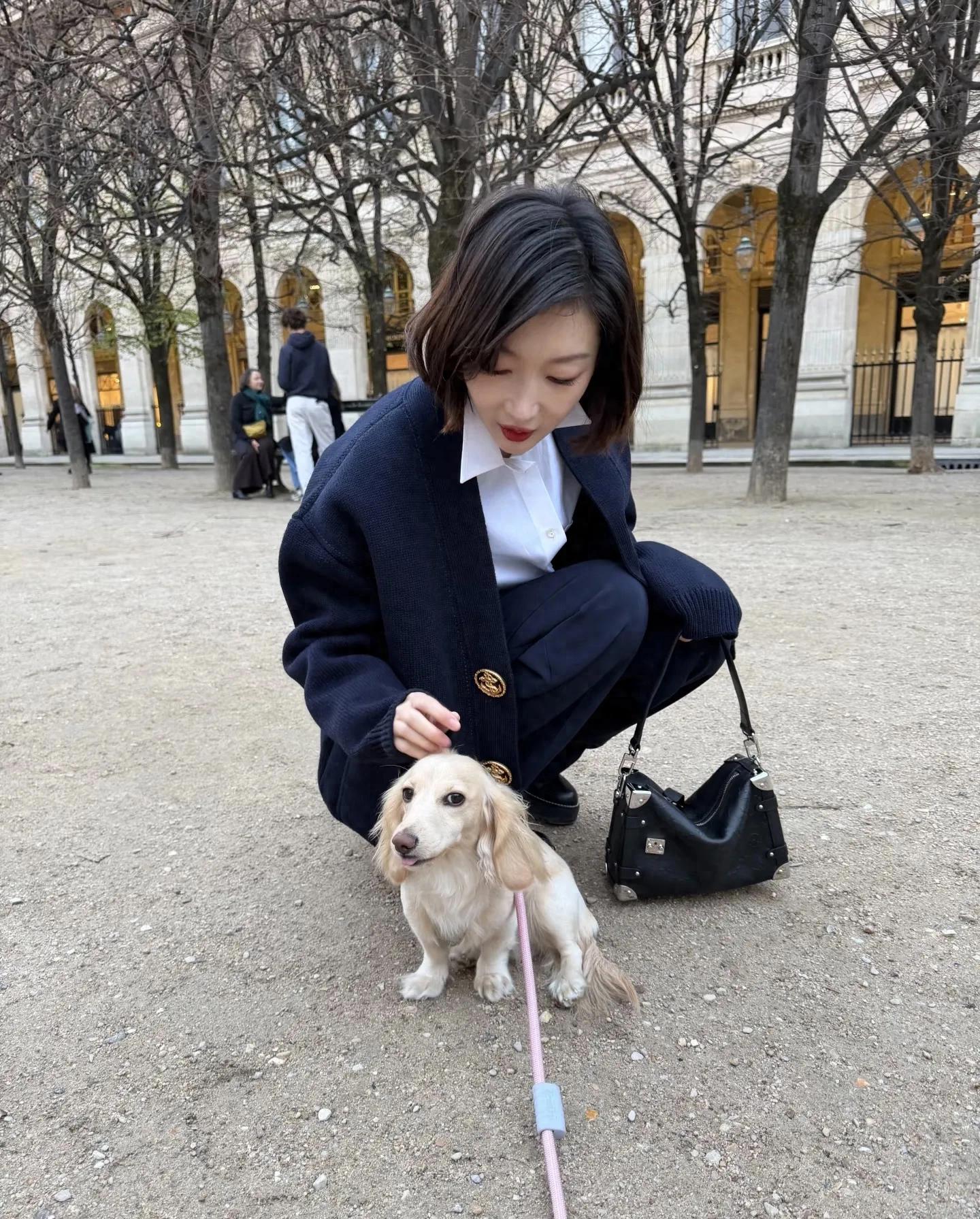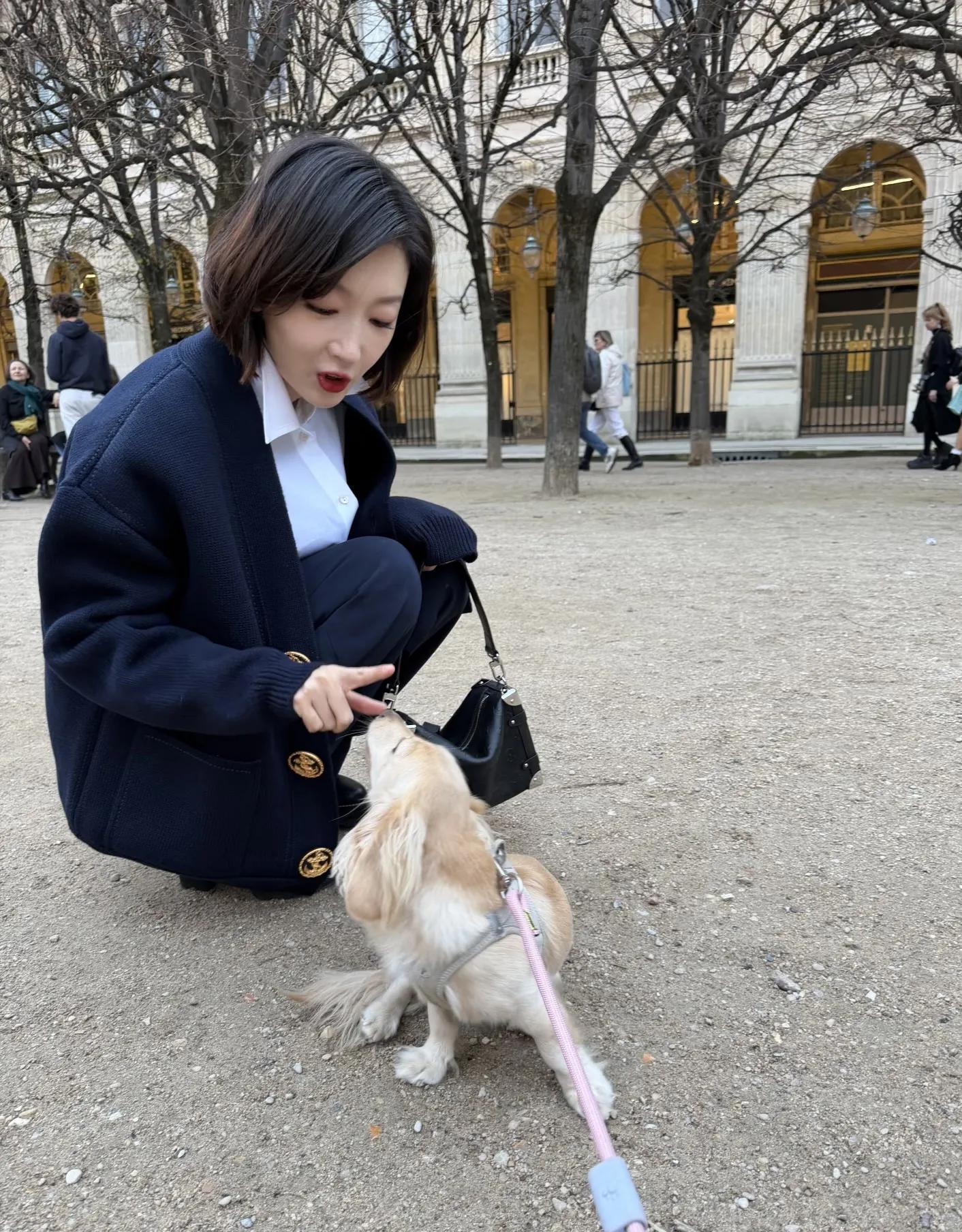 周冬雨巴黎街头蹲下逗小狗,气质漂亮,友好可爱!