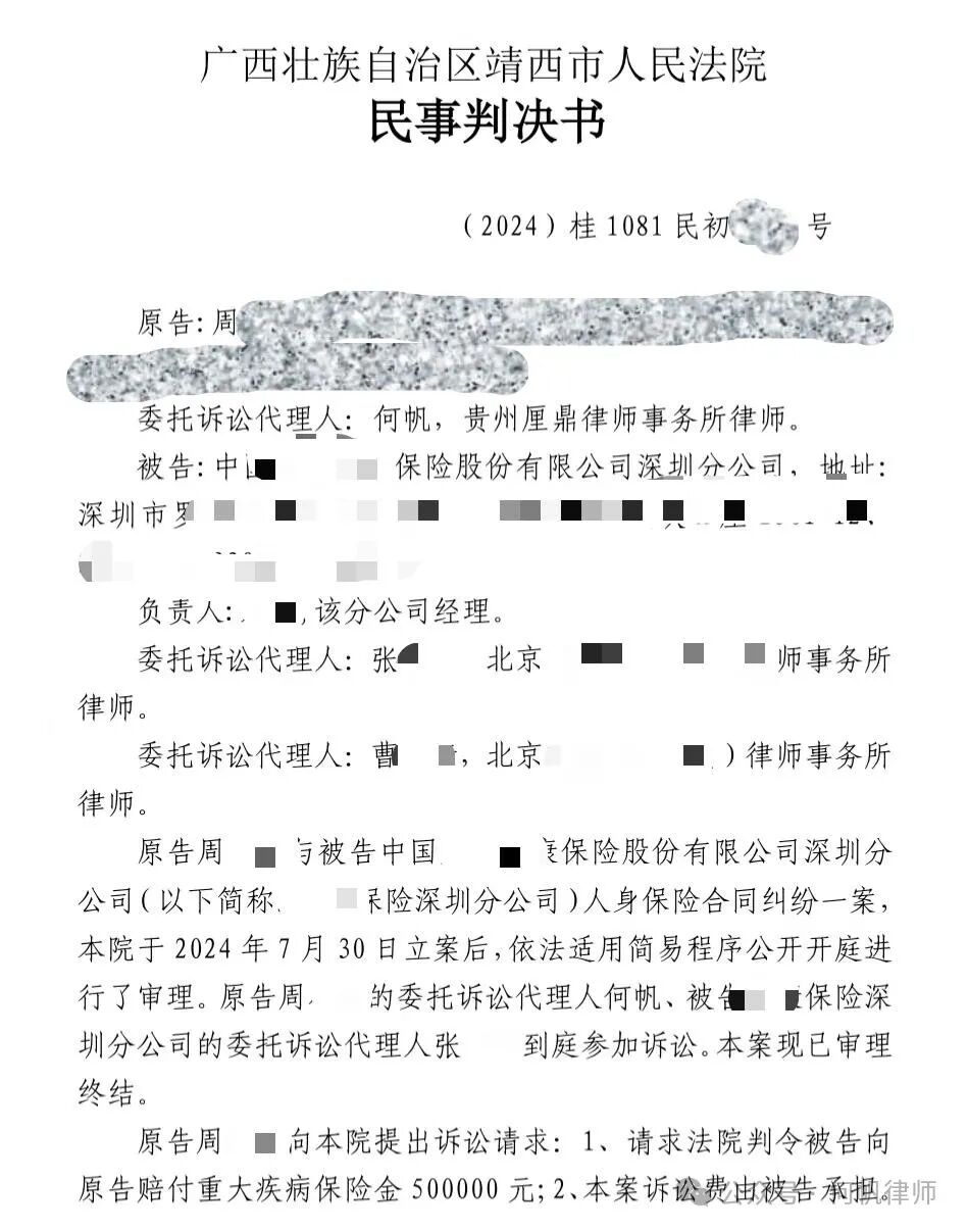 近日,保险理赔团队何帆律师成功代理了一起患烟雾病,保险公司拒赔重疾险案件,患者周某2021年在支付宝平台购买某保险公司重疾险,2023年底确诊为烟雾病,后向保险公司申请理赔,保险公司拒赔。周某找到了我们保险理赔律师团队,保险律师何帆、陈伟经过研讨,何帆律师作为代理律师,经过激烈的庭审辩论,提出非常专业的保险理赔代理意见,最终获得了法院的支持,周某一审获赔50万。