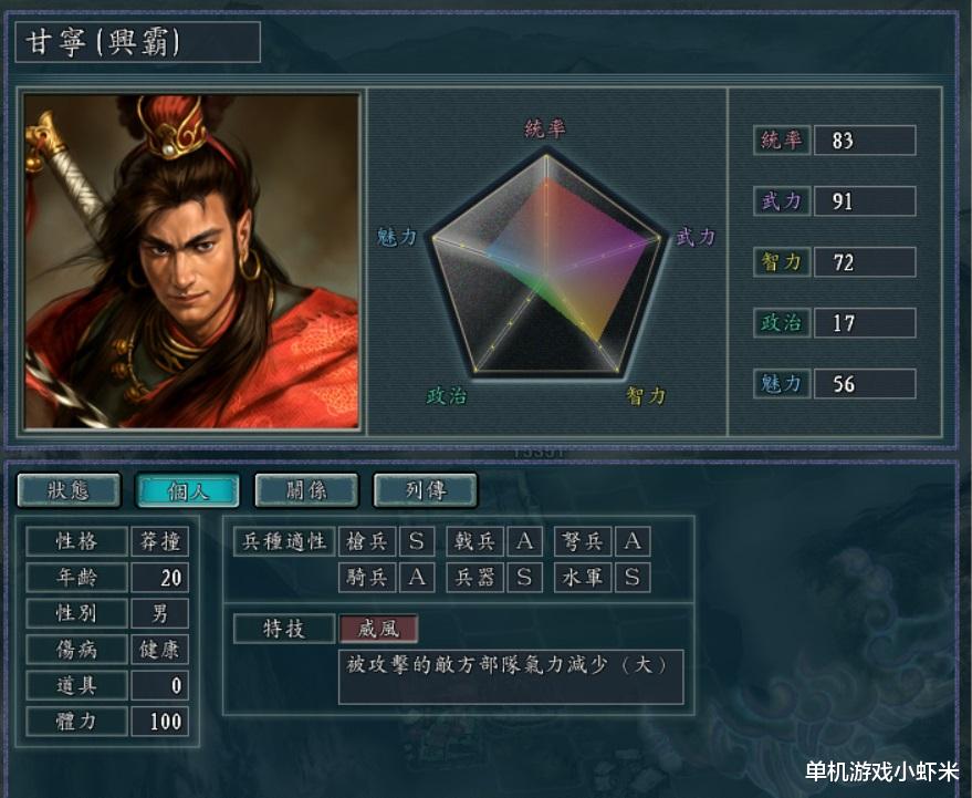 2,甘宁。全能型选手,和张辽一样的特技,最大限度削弱敌人的输出。